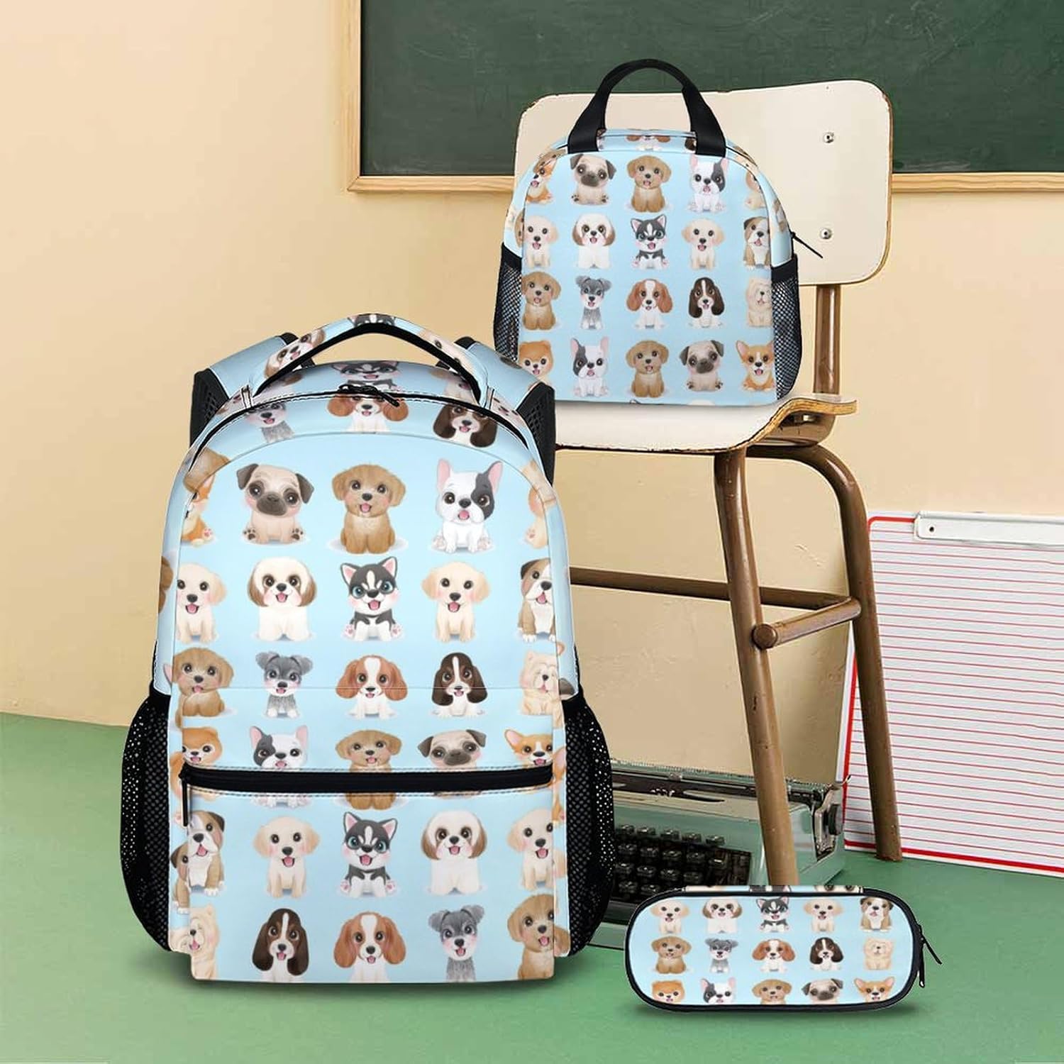 Dog Backpack with Lunch Box, Set of 3 School Backpacks Matching Combo, Cute Blue Bookbag and Pencil Case Bundle
