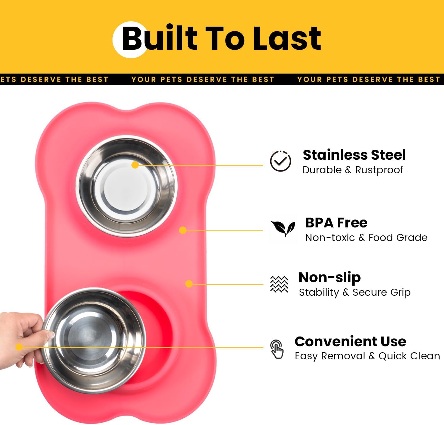 Dog Bowls with Silicone Feeding Mat, No Spill Food Water Dish Set, Dishwasher Safe, 2 Stainless Steel Puppy Bowls, Suitable for Tiny Dogs Kittens Cats Rabbits Pets under 8lbs, Extra Small, Pink