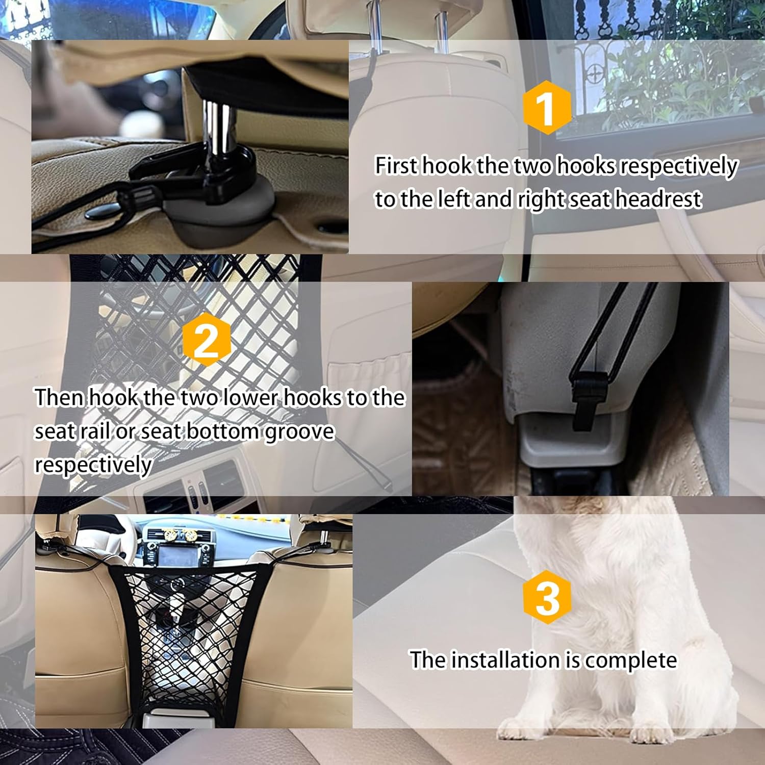 Hassle-Free Installation: Installing this car pet barrier is a breeze, as it fits seamlessly into the central gap between adjacent seats or attaches securely to the seatback. Utilizing hooks for fixation, the entire setup can be accomplished swiftly within minutes, without damaging your car’s interior.
