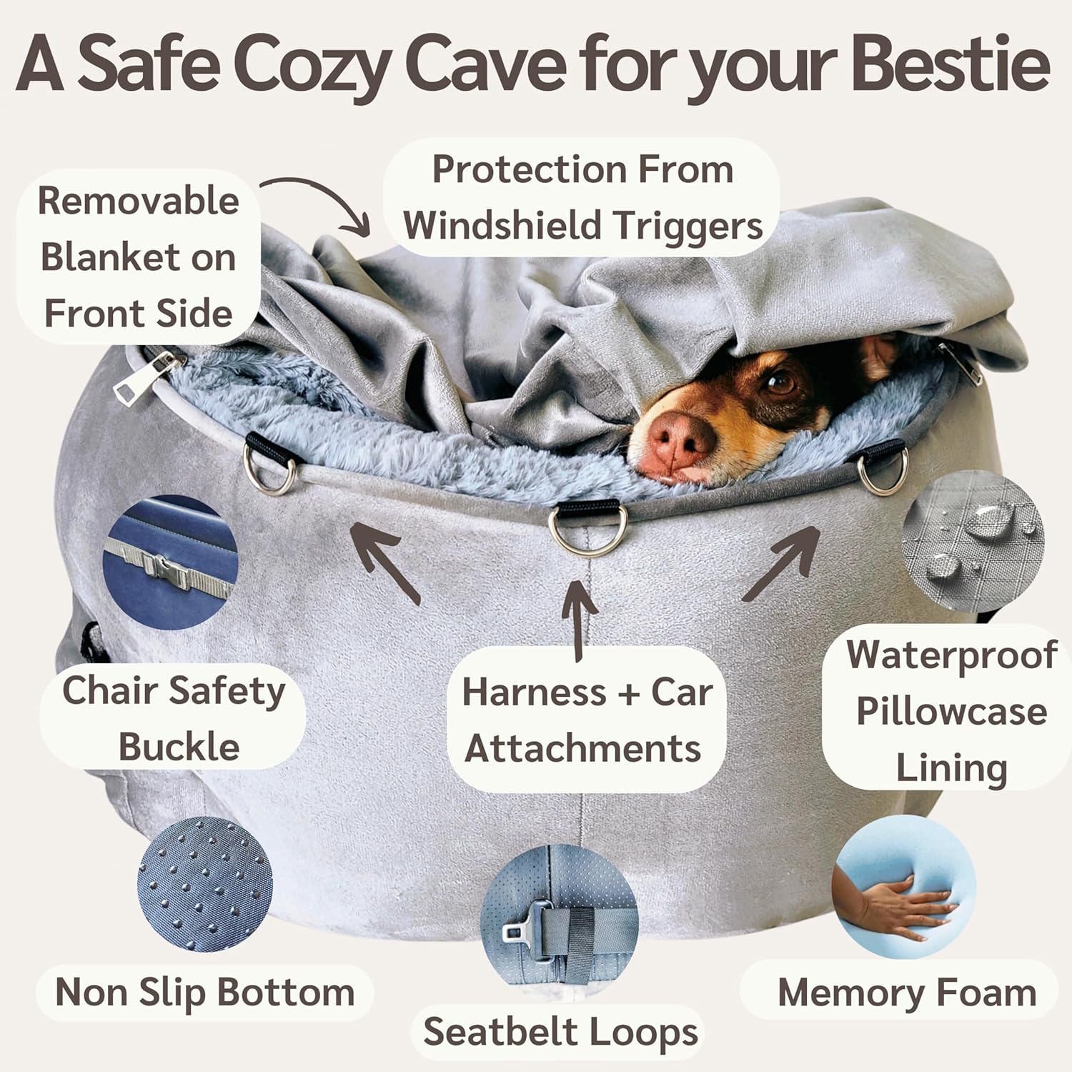 🚗 SECURE & DRIVER-FRIENDLY—NO DISTRACTIONS, JUST PEACE. The blanket stays put, no matter how much your dog digs—no flapping, no shifting. Just a cozy space that keeps them calm and keeps you focused. With two harness straps, seatbelt loops, anti-slip bottom, headrest and chair straps, safety is never a question. Fits in cars, SUVs, and trucks—front or back seat. And of course it protects your car’s upholstery from accidents and muddy paws.