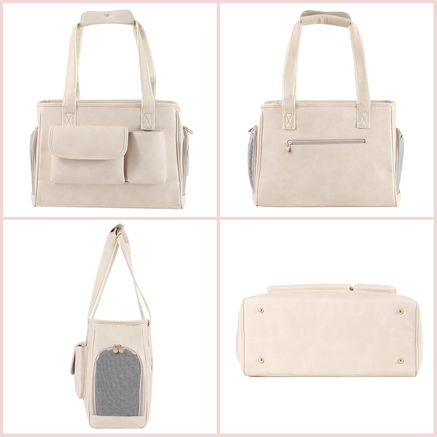 Dog Carrier Purse, Fashion Leather Pet Carrier Bag, Airline Approved Soft Sided Cat Travel Tote Bag with Pockets White