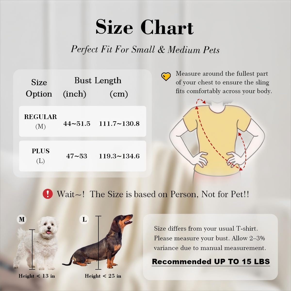 The pet sling carrier for small dogs and cat in two sizes only differ in the length of the shoulder straps. Please choose according to your body shape before purchasing. We hope everyone can pet sling that fits their size.