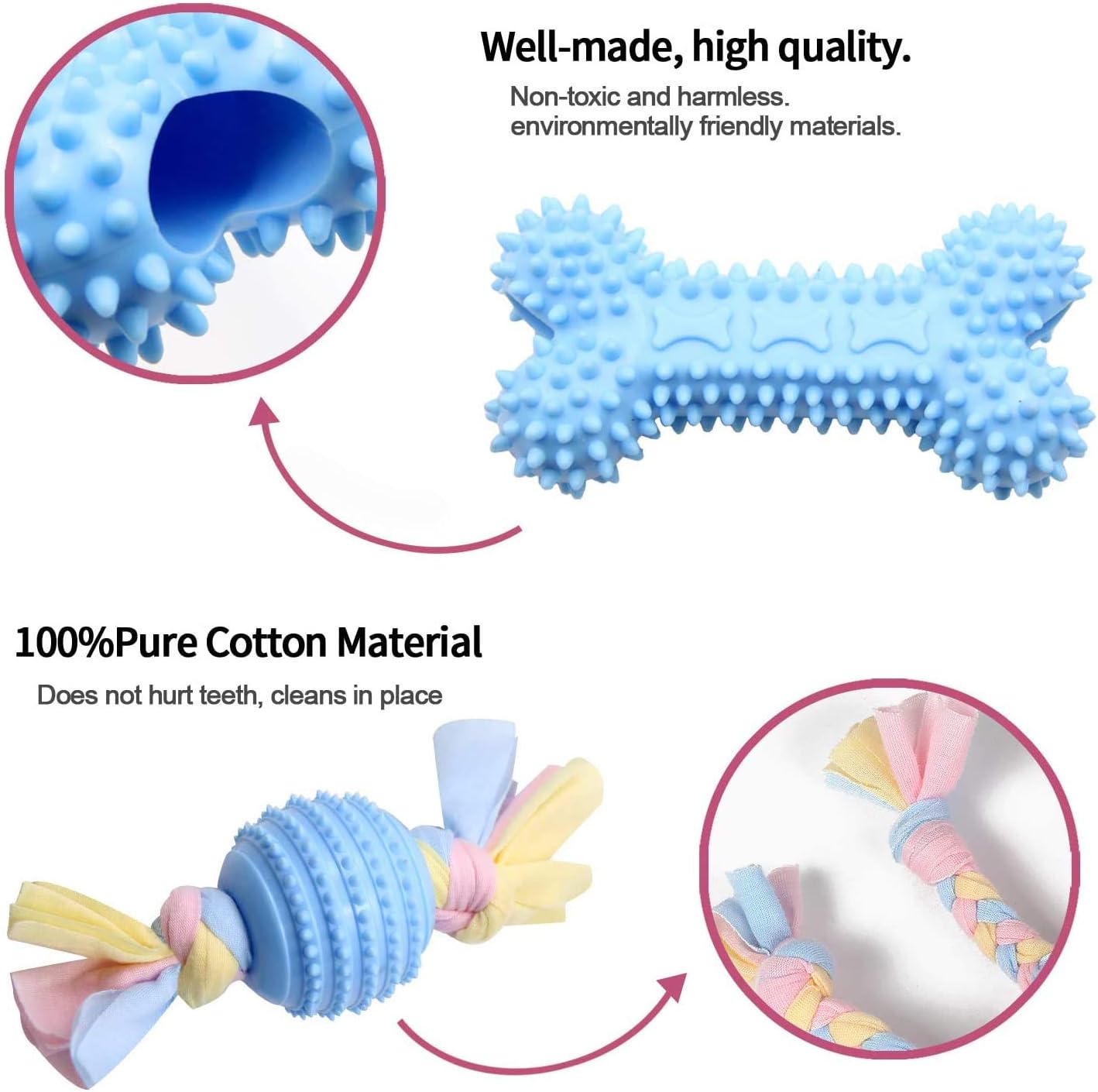 These puppy chew toys are made of TPR and nature washable cotton cloth,no fade and no harm for baby pup chewing and playing , long time to use.