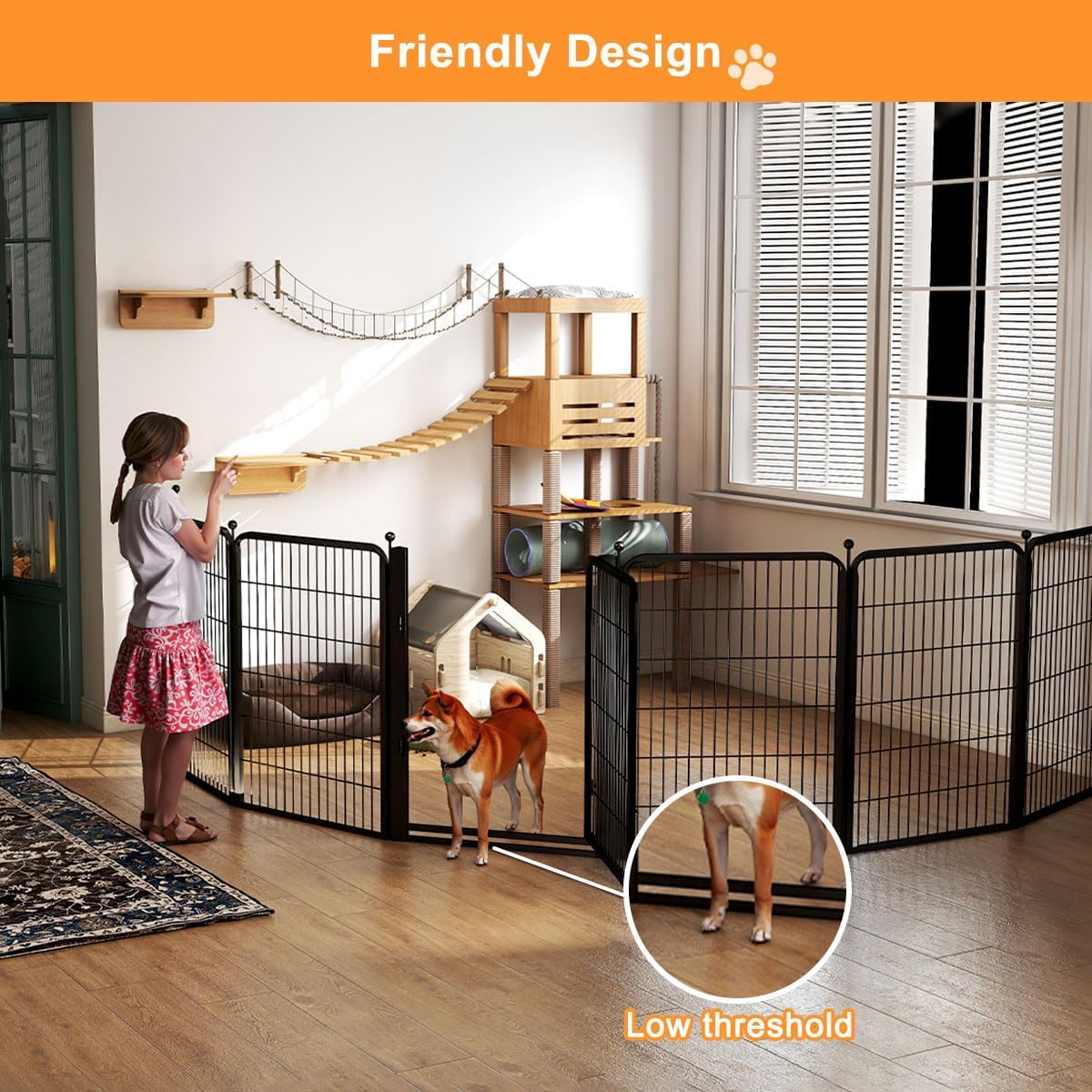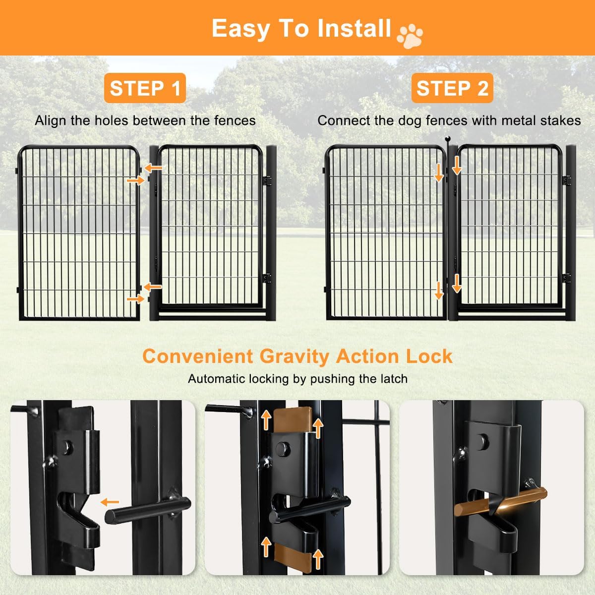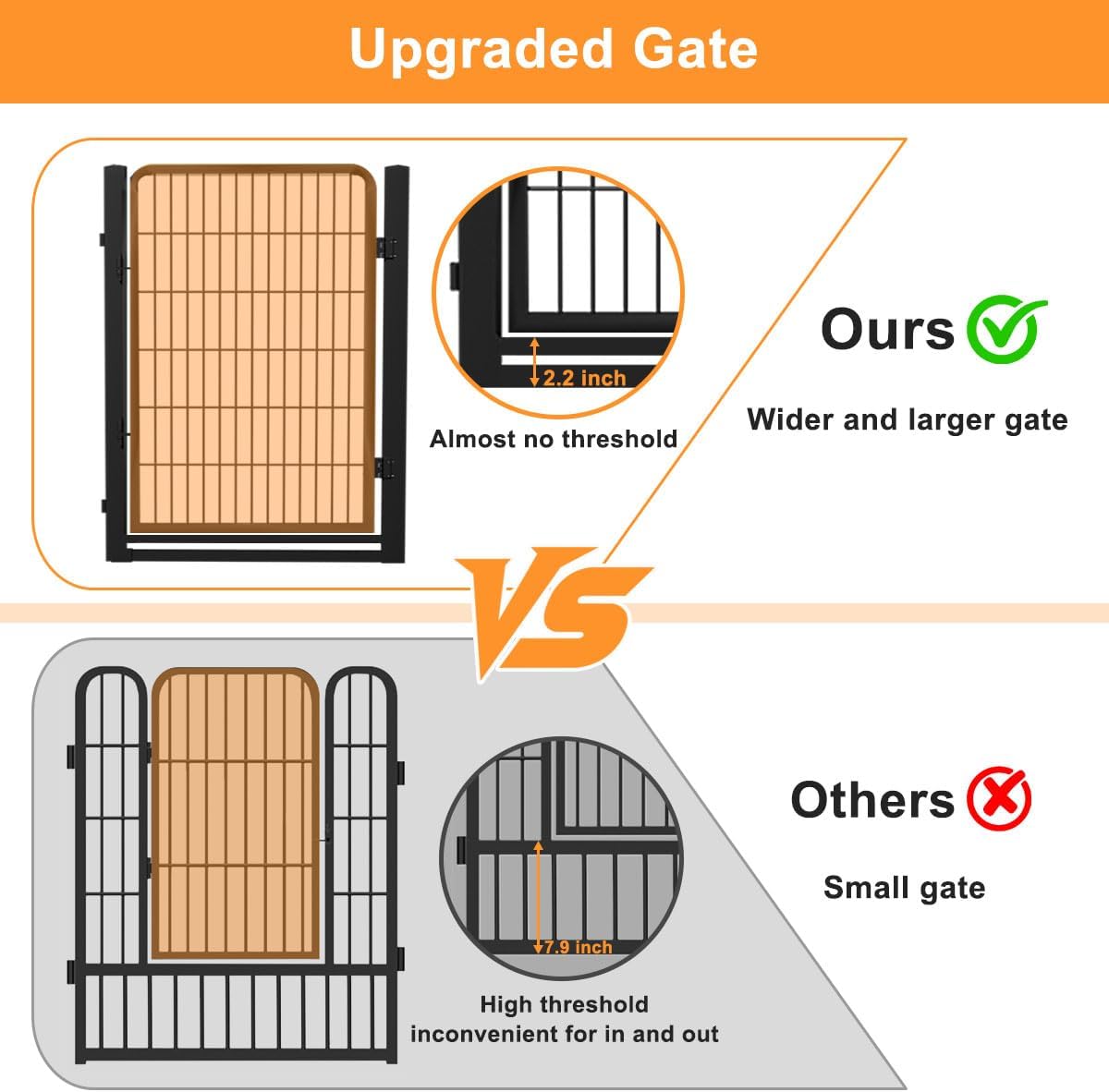 【Low Threshold & Wide Gate Design】:The step of dog fence is low,which makes it more convenient for both you and your pet to in and out;