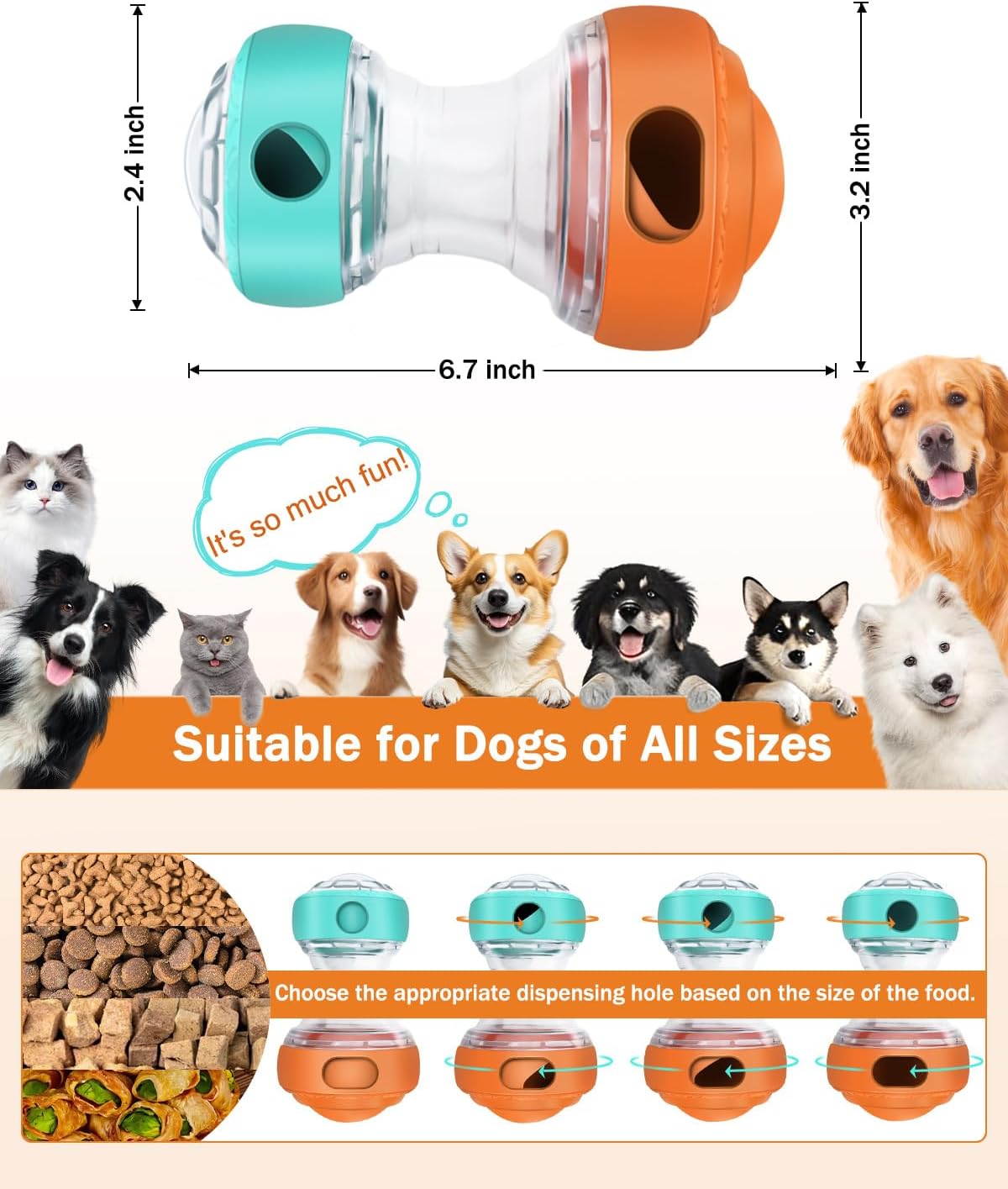 2 Adjustable Holes for Customized Feeding: Featuring two adjustable dispensing holes, this dog food puzzle feeder allows you to control the size of the openings to fit different types of treats—dry kibble, jerky, or biscuits. Adjust the difficulty level to challenge your dog’s problem-solving skills and slow down their eating pace for healthier digestion.