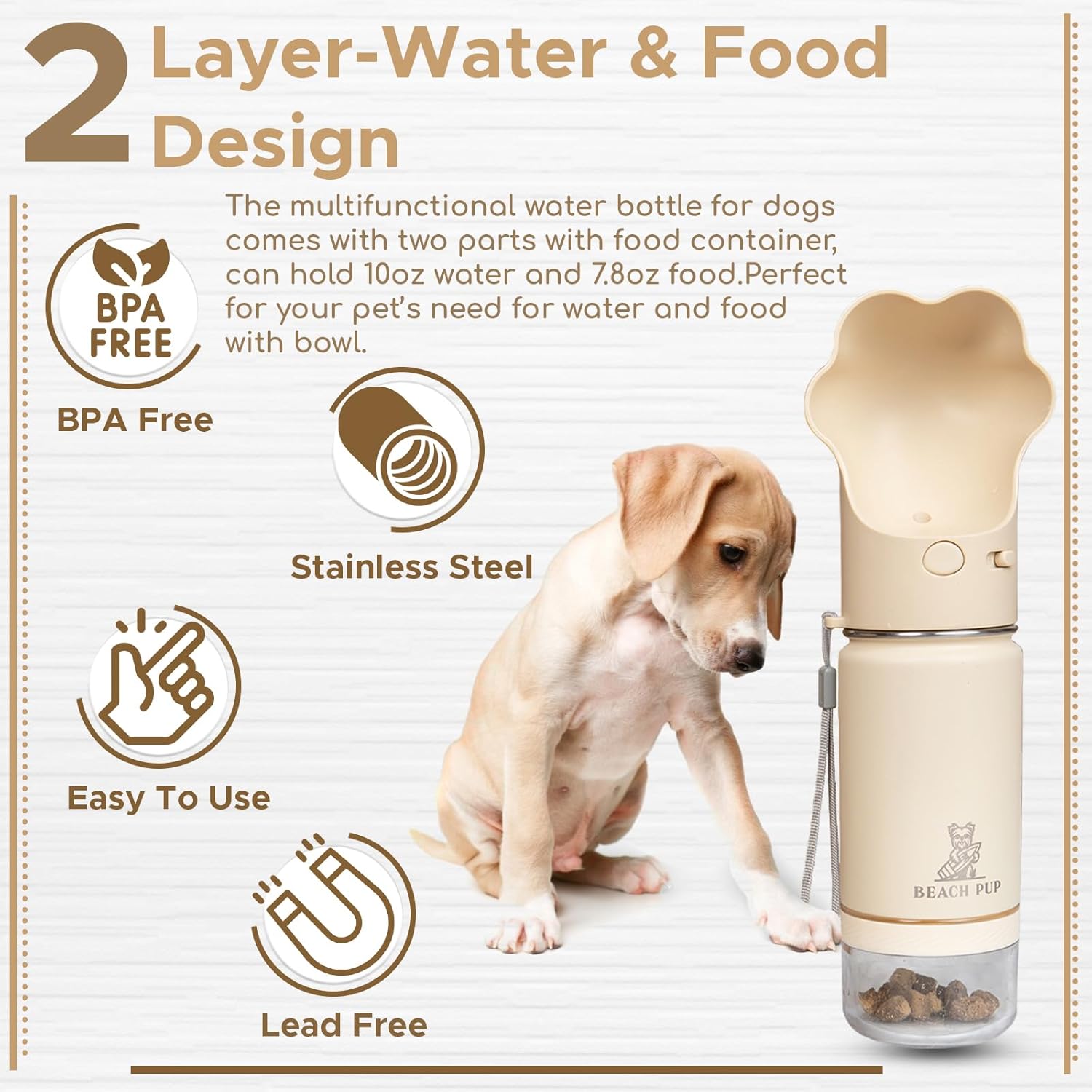 Dog Portable Water Bottle Stainless Steel 10 oz with Food Container – Pet Water Bottle – Cream Portable Dog Water Dispenser with Bowl and Container