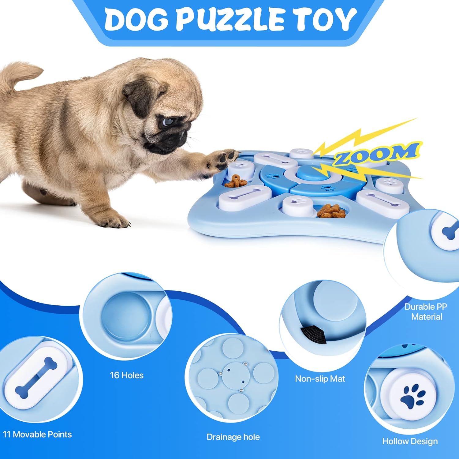 Designed with multiple levels of difficulty designs and the 16-hole dog treat dispenser, smart dogsand cats need to learn how to combine multiple steps to get the food reward hidden.
