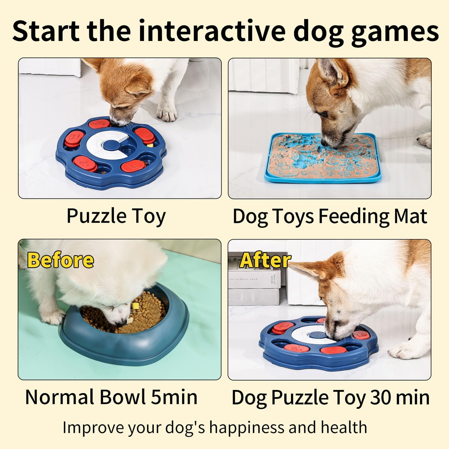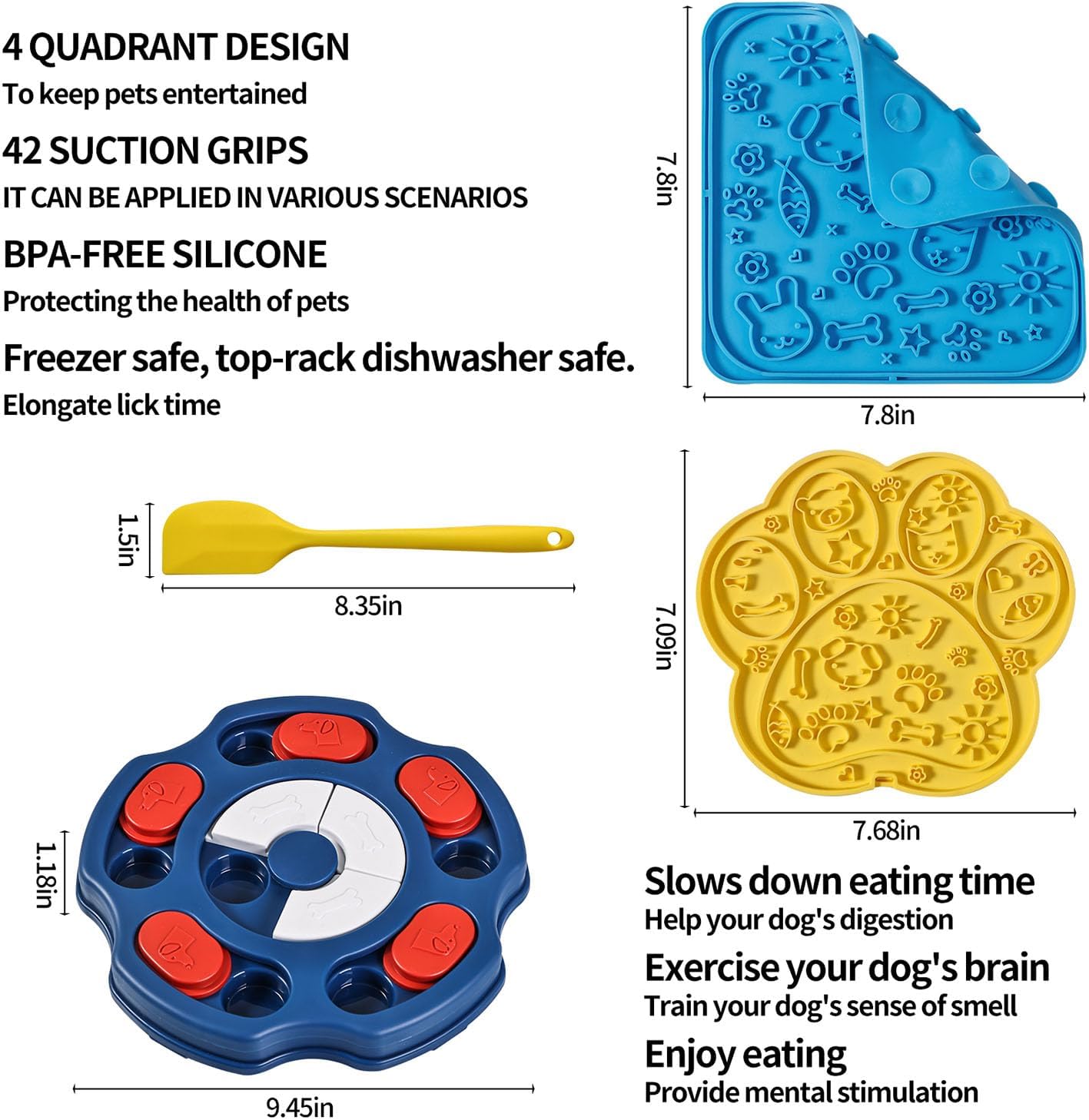 With our Dog Puzzle Toy Set: Keep your dog entertained and mentally stimulated. This set includes a slow feeder designed to prolong mealtime and 2 lick mat.