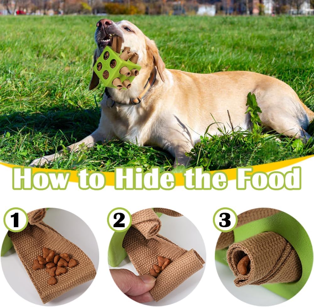 Non-toxic and Odorless Food Grade High Quality: The latest sniffing ball is an upgraded version of the traditional snuffle mat, making it more difficult for dogs to get food. The cube design and thick material make the toy stay firmly in place and will not roll around, even if it is Aggressive Chewers. Interesting shape and soft cloth strips are more attractive to dogs and make them more interested in sports.