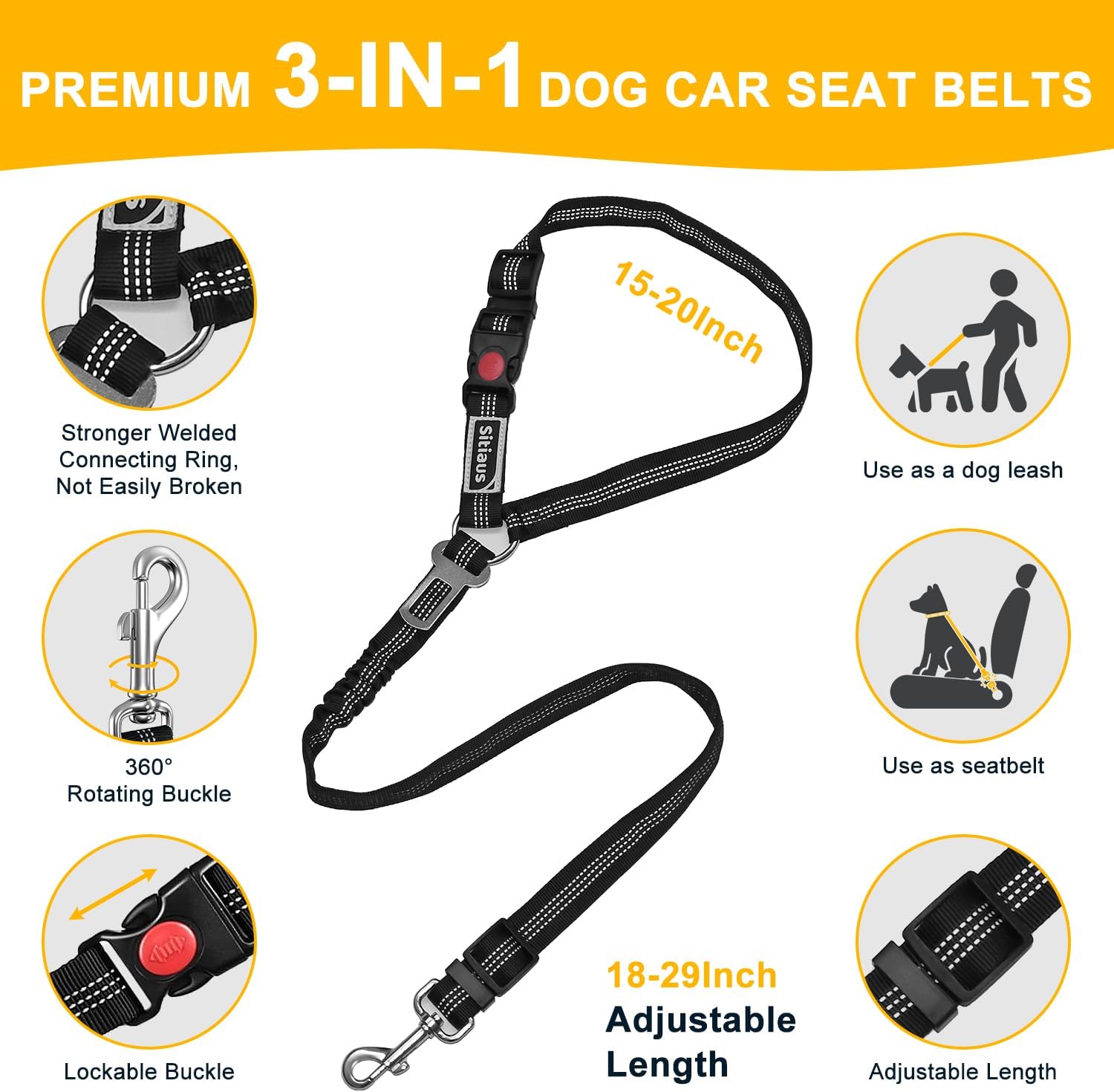 3 IN 1 VERSATILE DESIGN, TRIPLE PROTECTION FOR YOUR DOG! – Sitiaus multi-functional dog seat belt for car offers triple protection: a) Attaches to seat backrest, b) Secures in seat belt buckle, and c) Doubles as a reflective leash for nighttime walks. Perfect for pet lovers on the go, ensuring your dog’s safety during car rides.