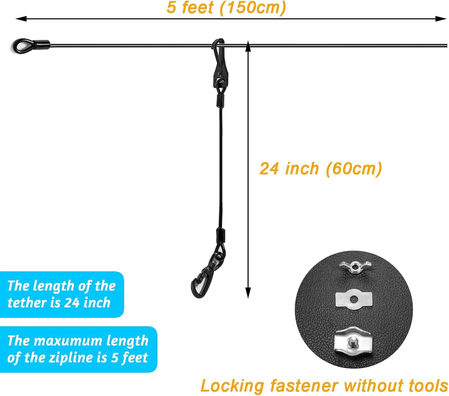 【Adjustable Size】The maximum length of the zipline is 5 feet. Fix it with screws, and then you can cut off the excess wire rope or roll it up.This length is easily adjusts to fit most cars, trucks and SUVs.