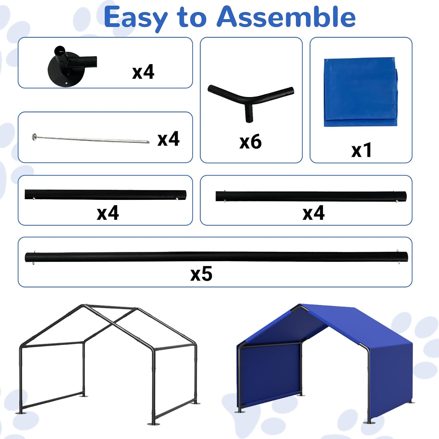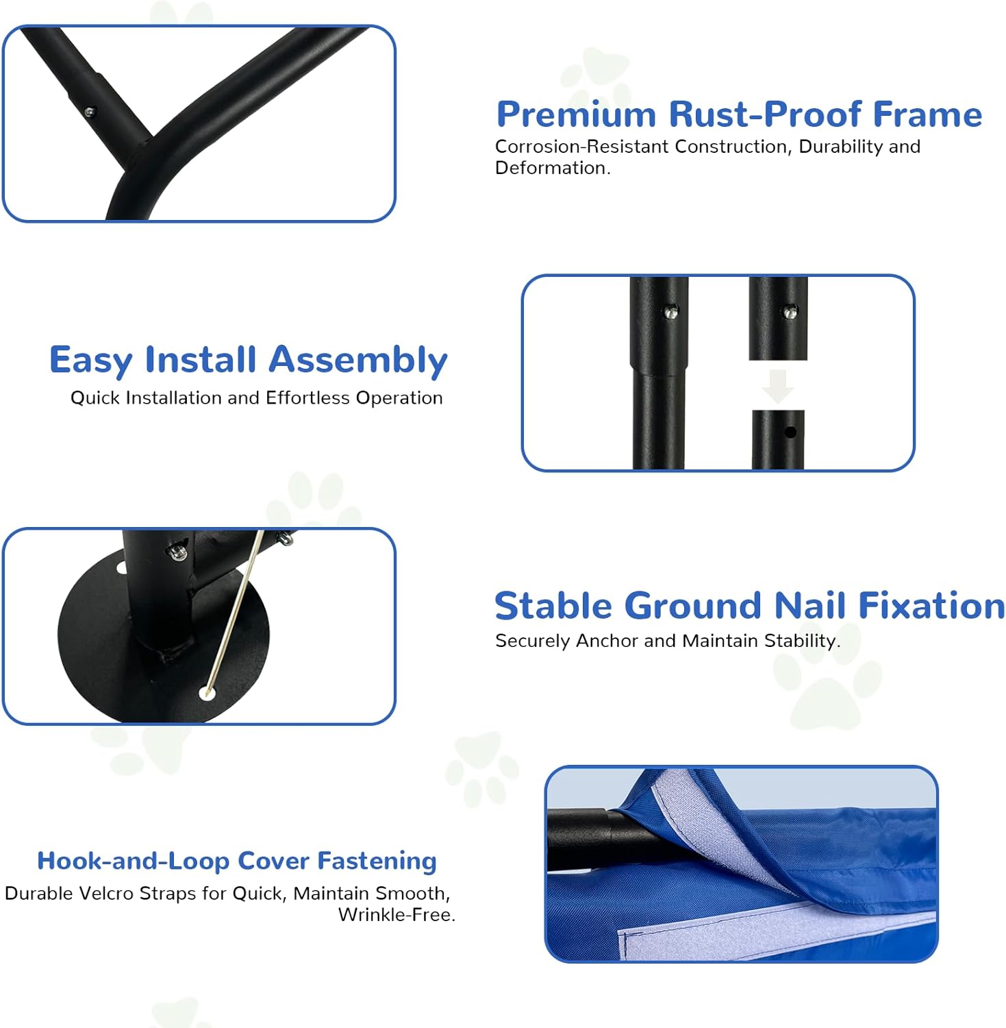 【Spacious & Multi-Pet Friendly】Measuring 4’x4’x3.3’, this sturdy dog shade shelter comfortably accommodates large breeds multiple small pets. The generous space allows pets to relax freely, while the durable steel frame ensures stability for active animals. Perfect for patios, yards, or farms.