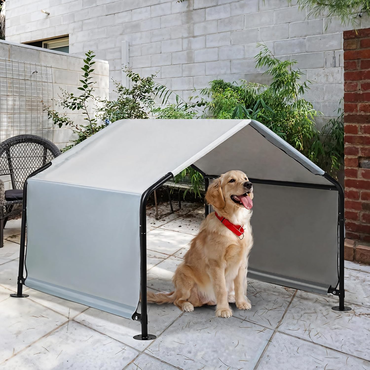 1.OUTDOOR SHADE SIZE: The size of the dog awning is: 47.24*46.46*38.19inchs. Suitable for medium and large dogs up to 55 pounds and up to 29.5 inches long.