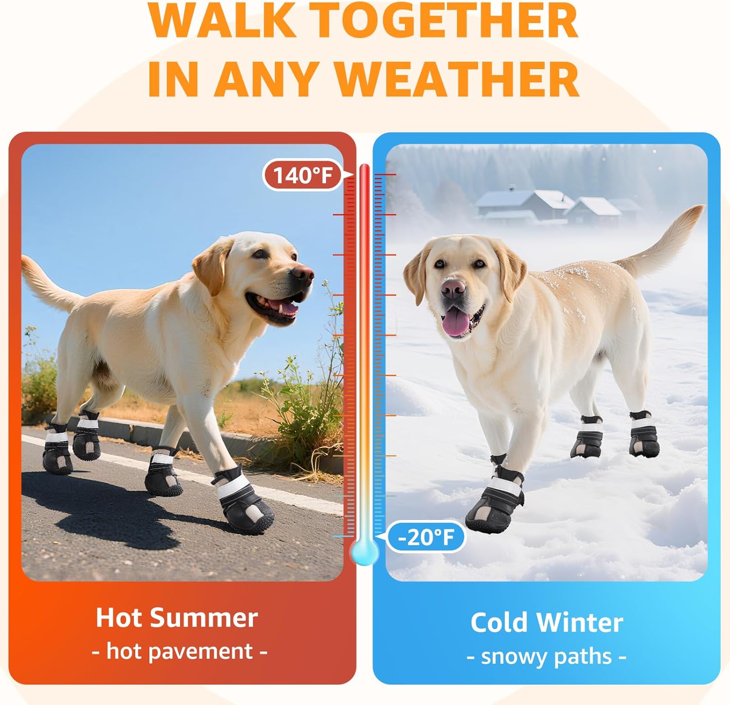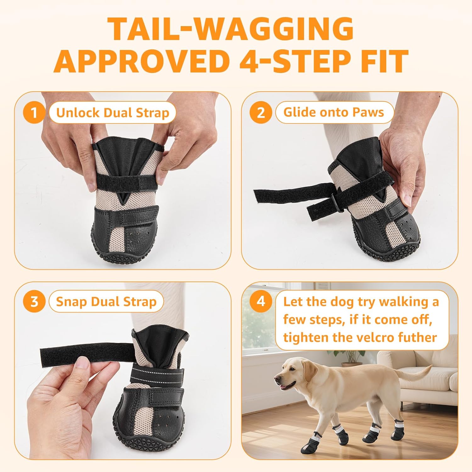 【DUAL STRAPS & REFLECTIVE DESIGN】 Each pair of doggie boots features 2 adjustable reflective straps with strong Velcro, making it easy to adjust the fit for different sizes, secure yet simple to put on and take off. The high-visibility reflective strips enhance safety in low-light conditions, helping you quickly spot your dogs during nighttime walks or runs. Ideal for outdoor walks, night runs, and hiking adventures