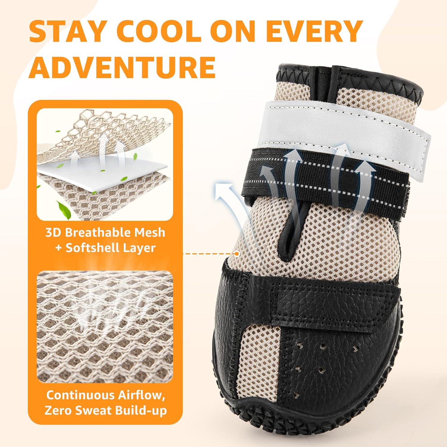 【BREATHABLE & COMFORTABLE】Crafted with 3-layer breathable mesh fabric and durable waterproof PU leather, these dog booties for hot pavement keep your dog’s paws cool, dry, and comfortable. Perfect for summer hot pavement, rainy walks, hiking, or indoor and outdoor play—your pup stays protected from sweat and moisture in every season