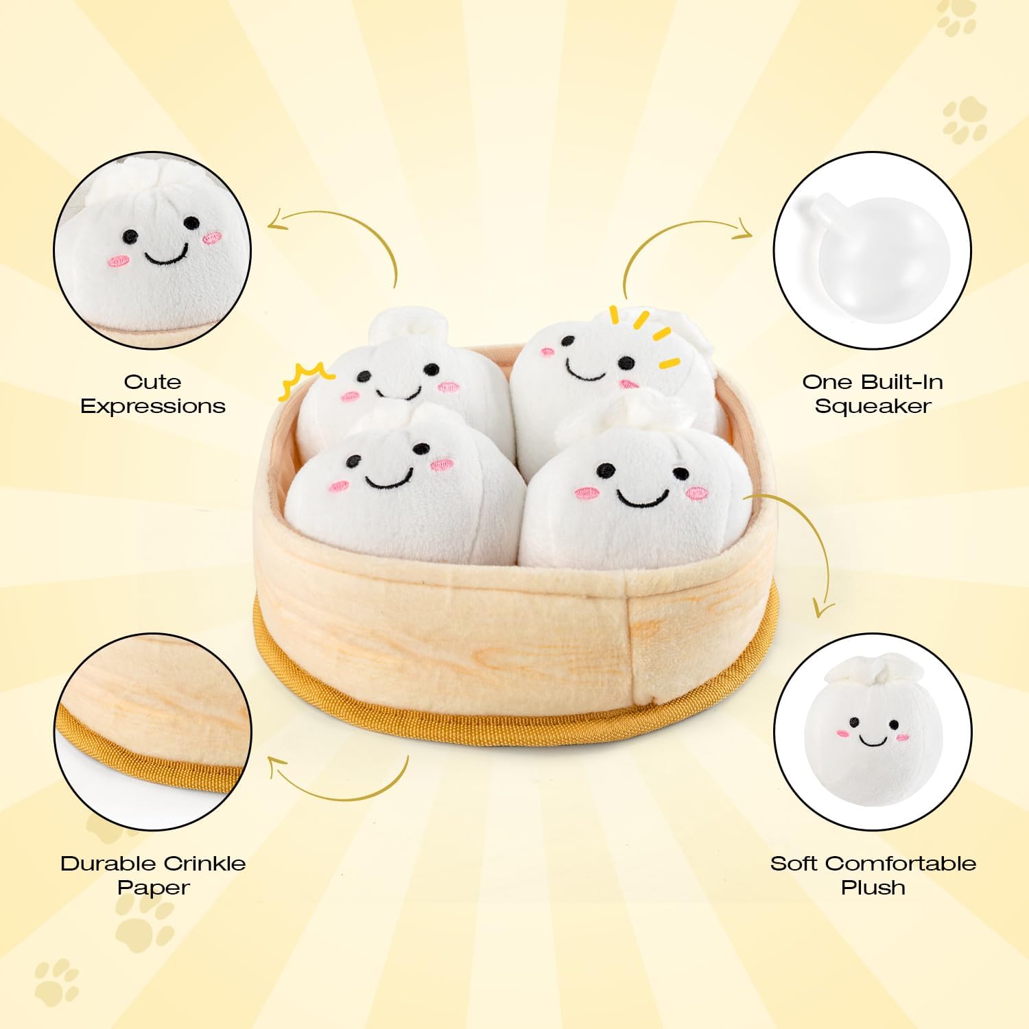【5-Pack Dog Toy for Throw and Fetching Game】Sedioso newest plush dog toy pack consists of 4 steamed stuffed buns and a cage drawer for a total of 5 toys, the 4 buns are perfect size as interactive toys to play throw and fetch games with your dog, the cage drawer is made of chew-resistant cloth and crinkle paper, which not only serves the purpose of holding the buns but also can be used as a chew-resistant unstuffed plush dog toys on its own!