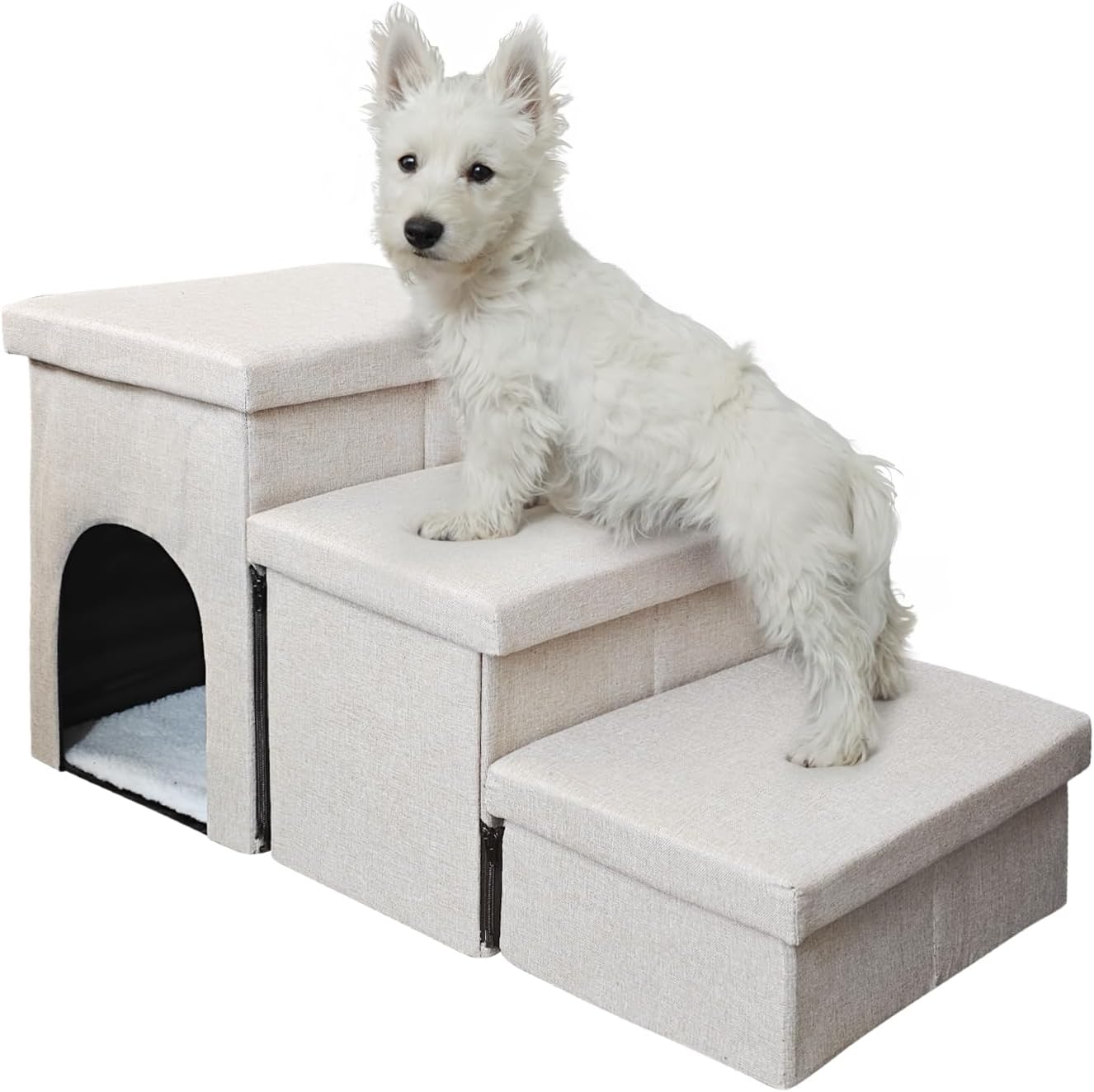 【3-IN-1 DOG STAIRS AND STORAGE】Dog stairs are each step features a convenient storage space, but also three storage boxes for dogs or cats objects, you can put dog’s clothes, traction, blankets and nursing tools or other pet accessories in for finding easily.