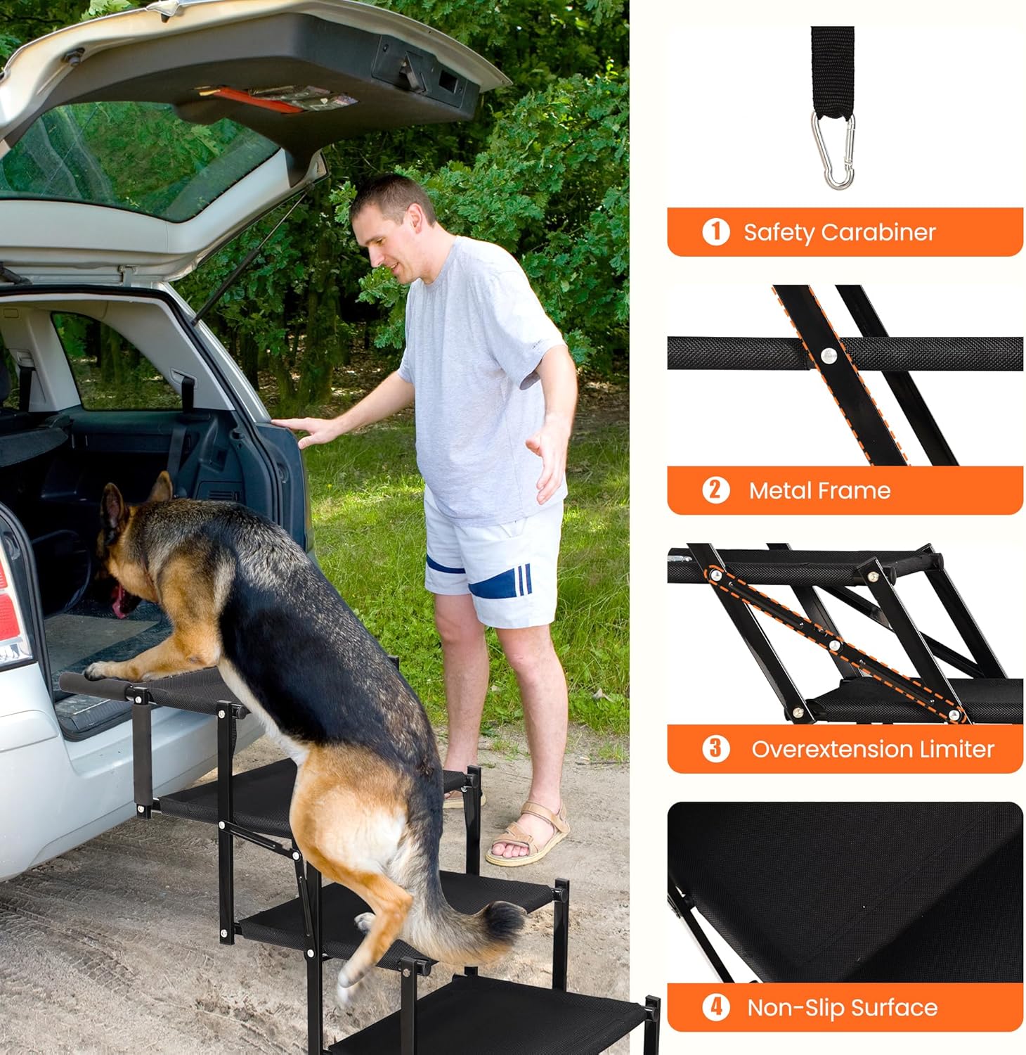 Safe & Non-Slip: Each step has a non-slip surface to stop slips. The 16.5-inch dog stairs come with safety carabiners to secure them to your vehicle—no wobbling, so your dog climbs safely, no injuries