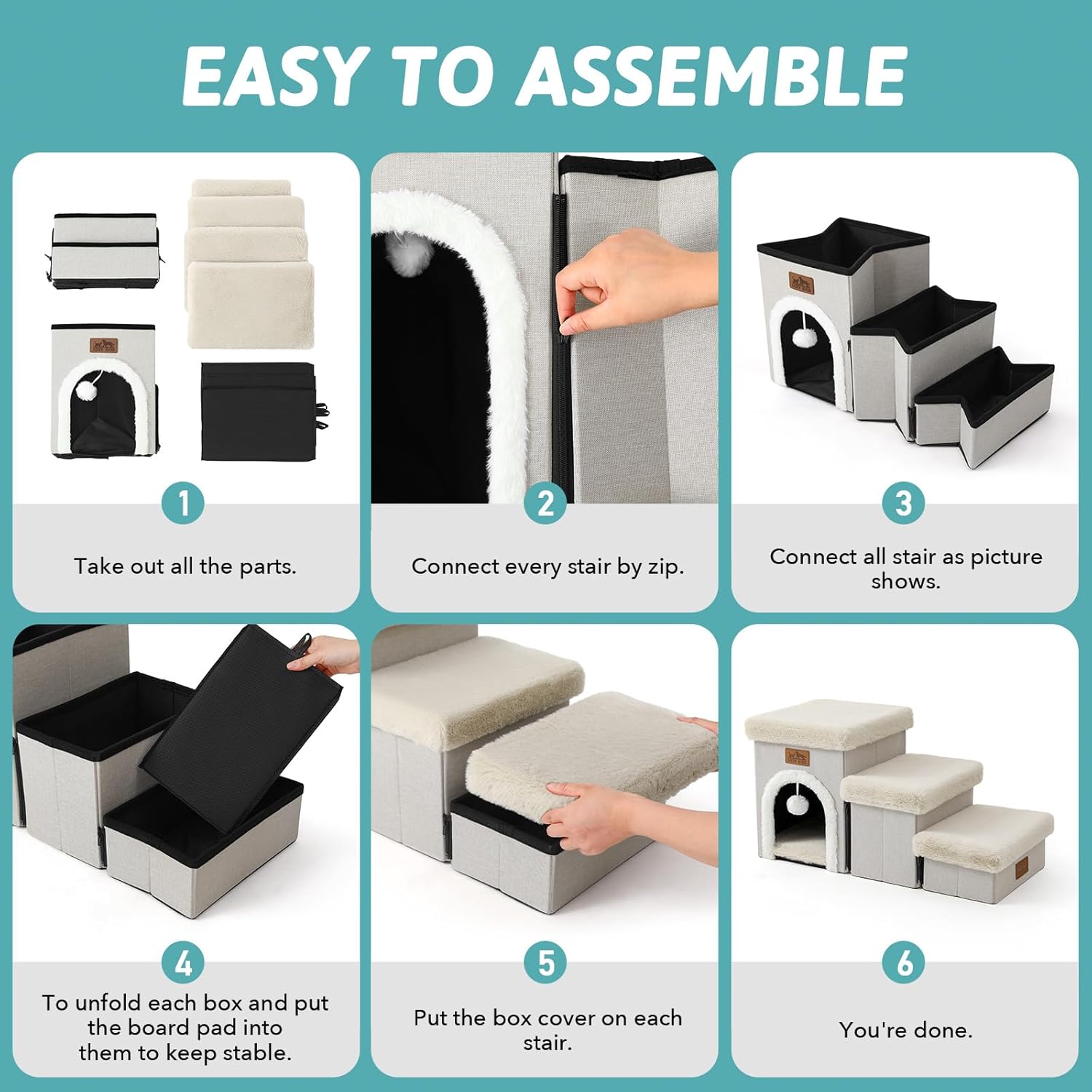 EASY TO ASSEMBLE AND STORE: Stairs for dogs to get on bed come with detailed assembly instructions and can be quickly assembled without the need for tools. Simply zip the steps together and add the bottom cushion for a solid dog ladder. When not in use, the cover can be removed, and the stairs can be folded up for easy storage.