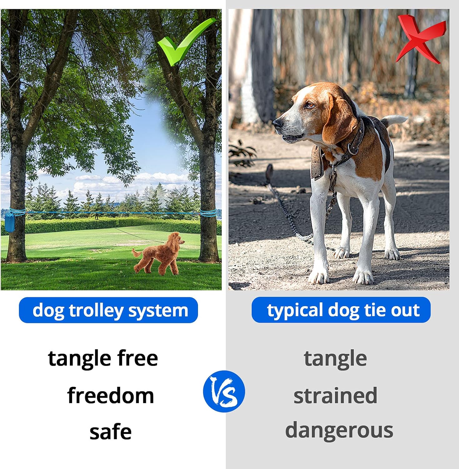 🐶EASY TO INSTALL & REMOVE:Dog trolley system is specially designed for dog outdoor events,which can be installed quickly by one person within 5 minutes.Set up anywhere you want, between two trees or other anchor points.Whether in parks, gardens, forests, mountains or your own yard,you can take your pets together on all kinds of adventures