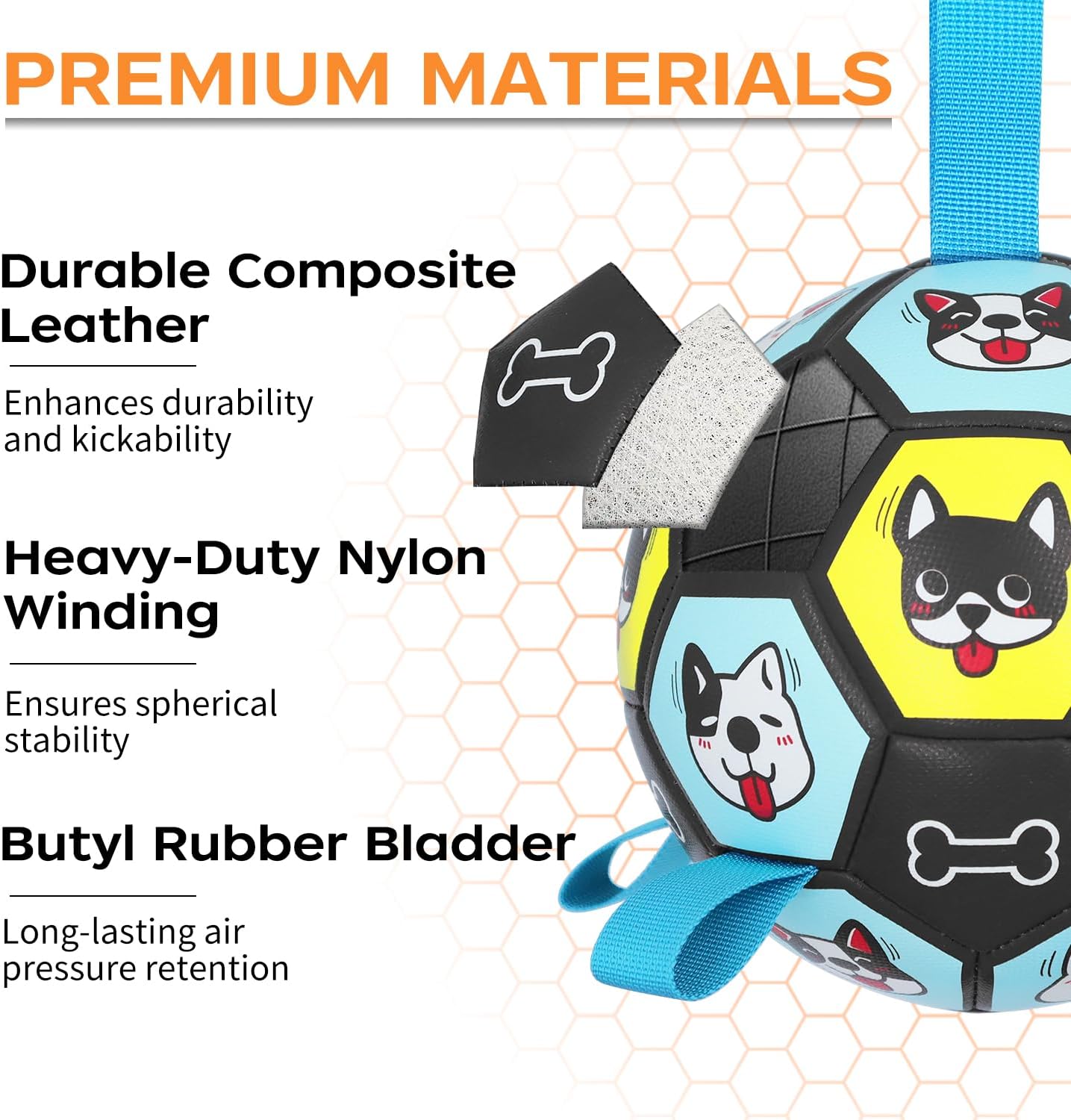 SAFE & DURABLE MATERIAL- Crafted from premium-quality Composite Leather, our dog soccer balls offer the same robust durability as professional soccer balls and meet rigorous safety standards akin to children’s toys. These balls are ideal for large dogs weighing between 30-90 lbs. Get ready for some high-energy playtime!