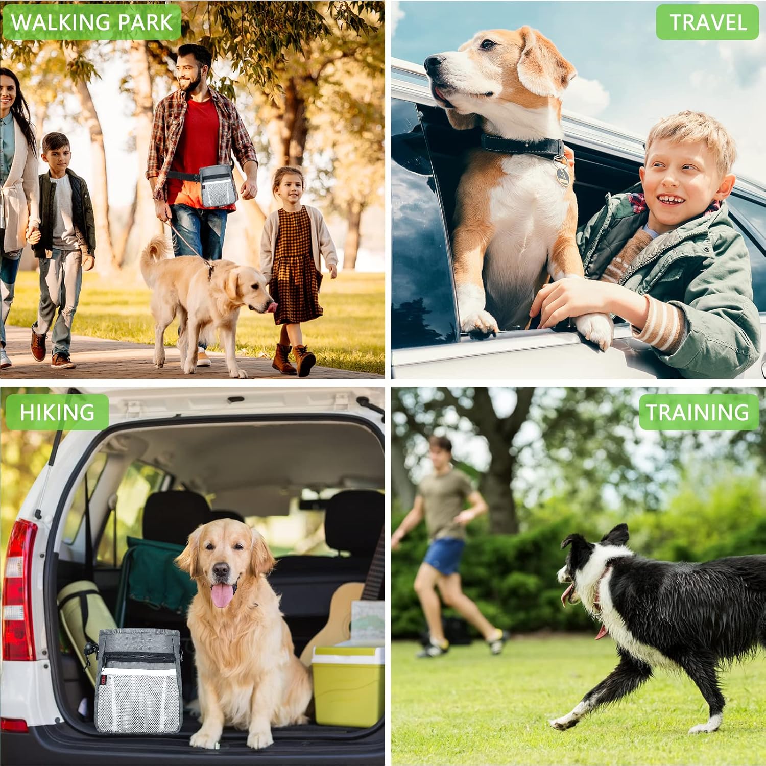 Large Dog Treat Pouch [Best High-Capacity Option] — The dog treat bag is capable of holding more treats, accessories, and dog toys (and even larger items, like tennis balls) than most other options on the market. And a poop bag holder on back, so that you can prepare immediately when you need it
