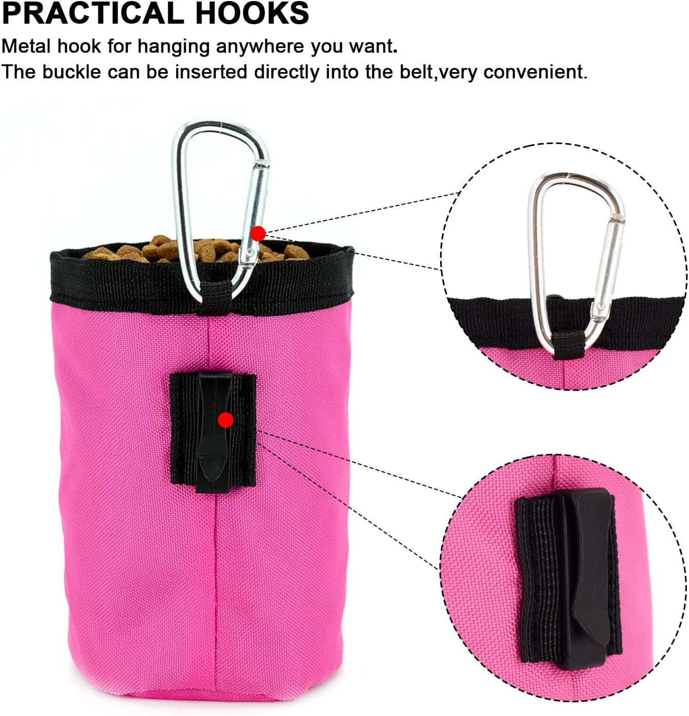 Hands-Free Dog Training: Our dog treat pouch comes with a metal carabiner and clip, so you can easily clip it to your waist or favorite backpack and train your puppy without any distractions.