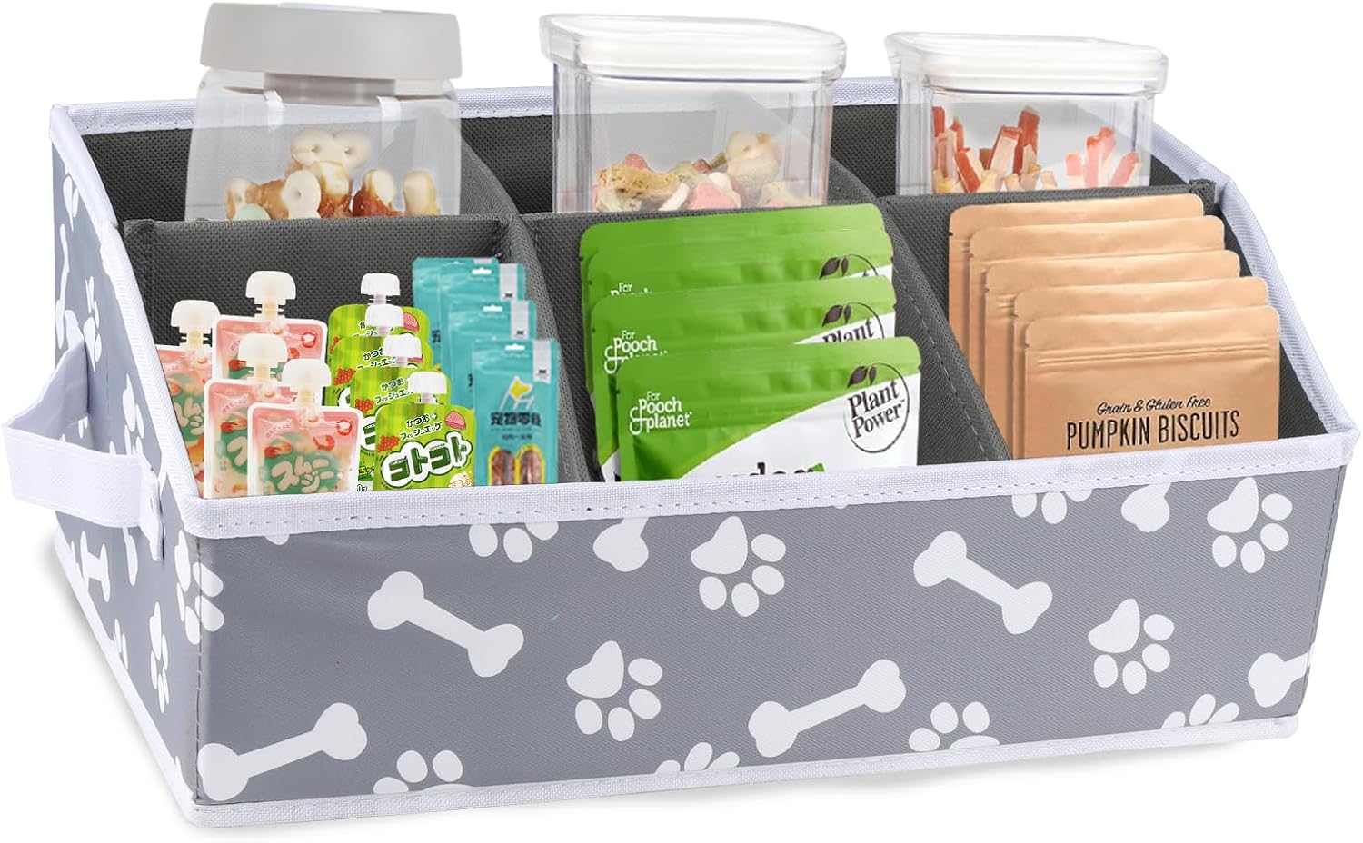 Dog food storage organizers: Designed six compartments create order to any clutter or chaos. 2 pcs removable dividers match the basket, you can adjust the size of compartments any time. Perfect for organizing pet food treats snack biscuit kibble.