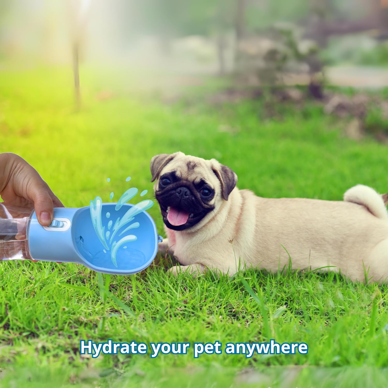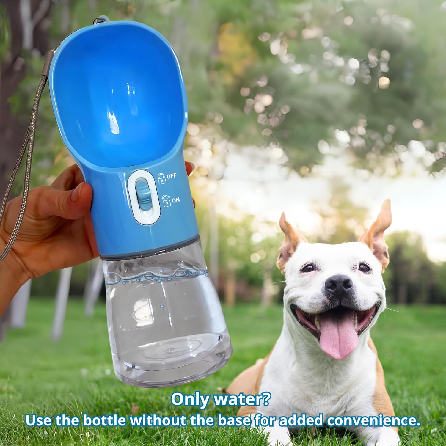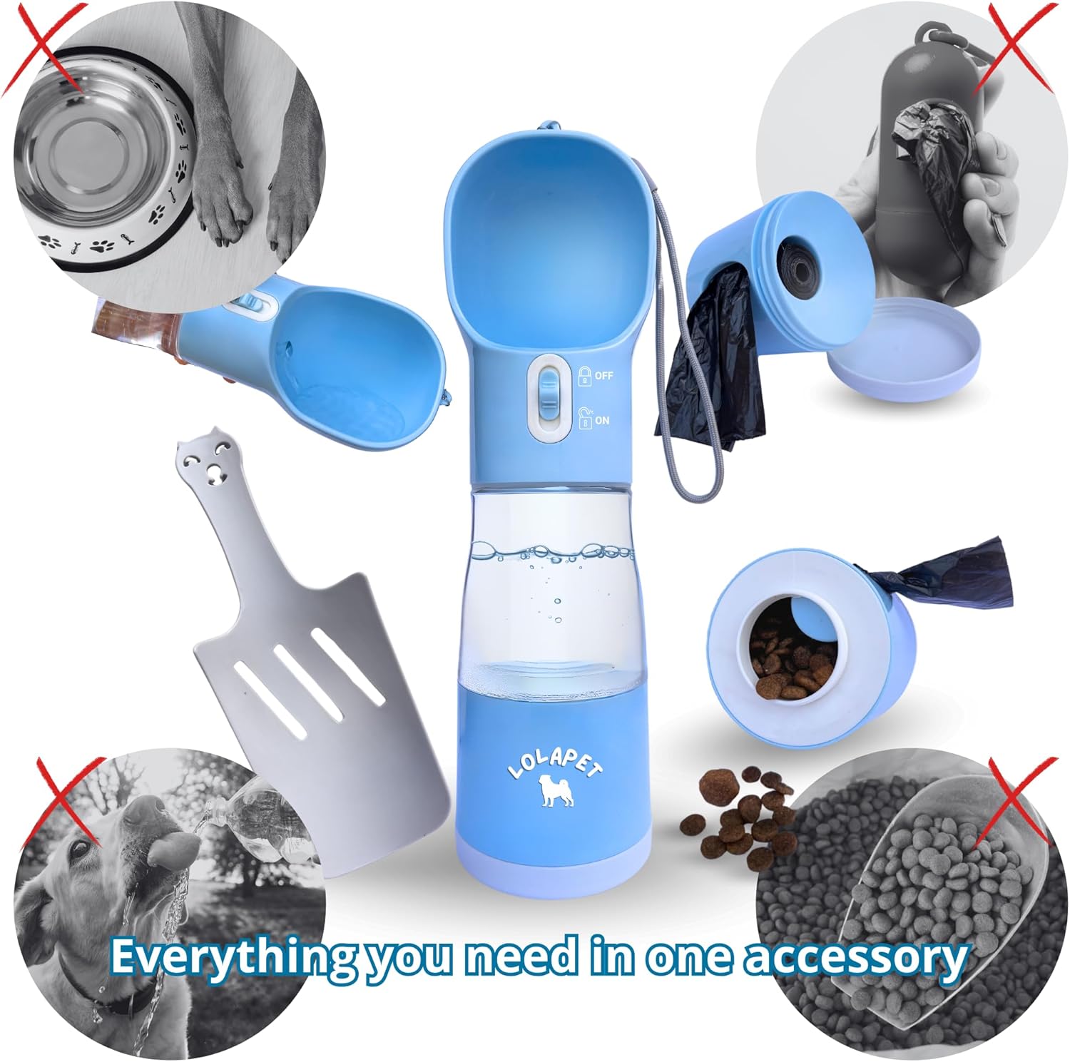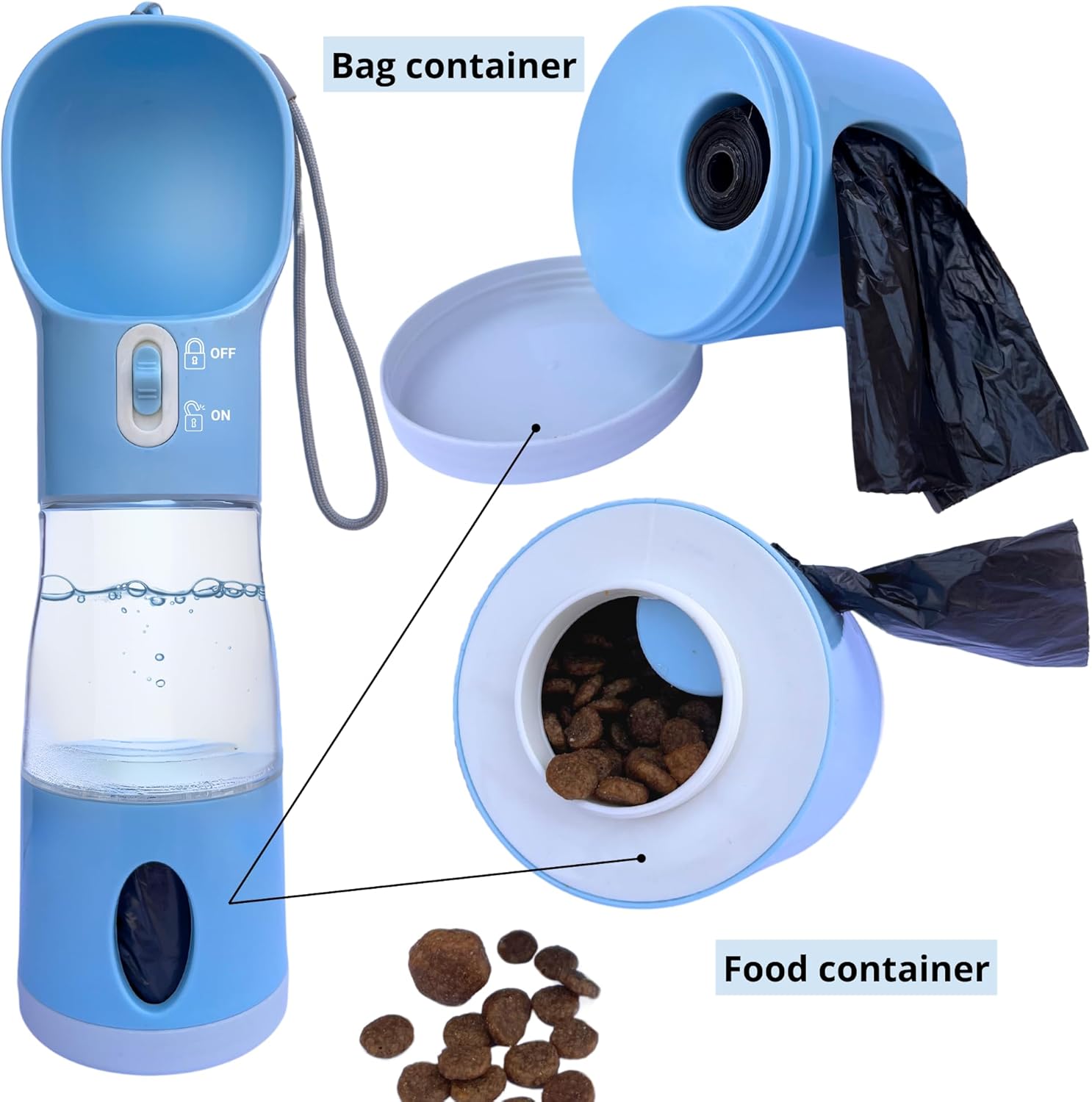 Multifunctional Portable Dog Water Bottle 4 in 1 : This portable water bottle for dogs and cats combines a water dispenser with a food container, a poop bag holder, and a poop shovel. You can use it just as a dog water bottle, or also carry a portion of food and waste bags, offering an all-in-one solution for walks and trips.