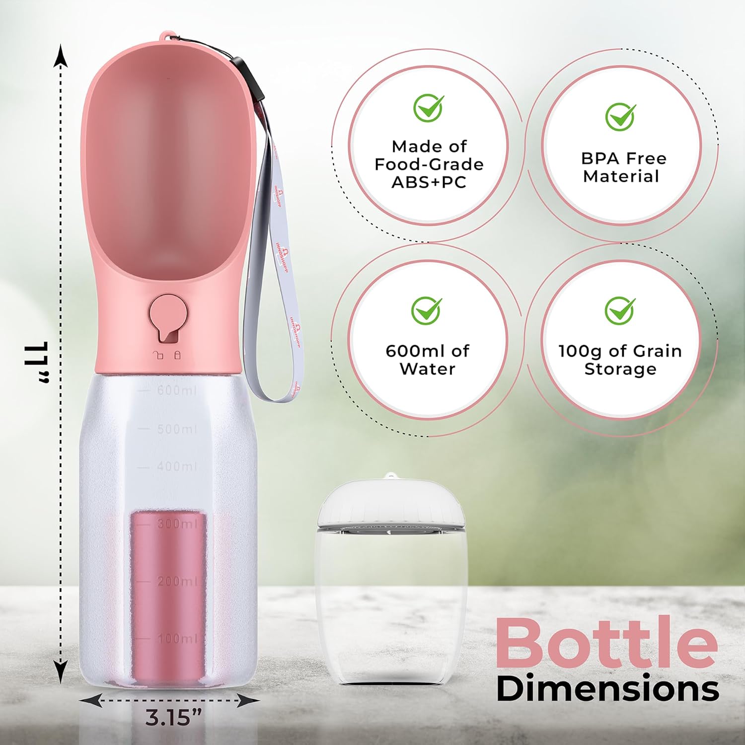 Dog Water Bottle – Portable Pet Water Bottle with Food Container & Poop Bag Dispenser – Lightweight, Leak Proof & BPA Free Dogs Drinking Bottle for Walking, Hiking & Travel (Pink)