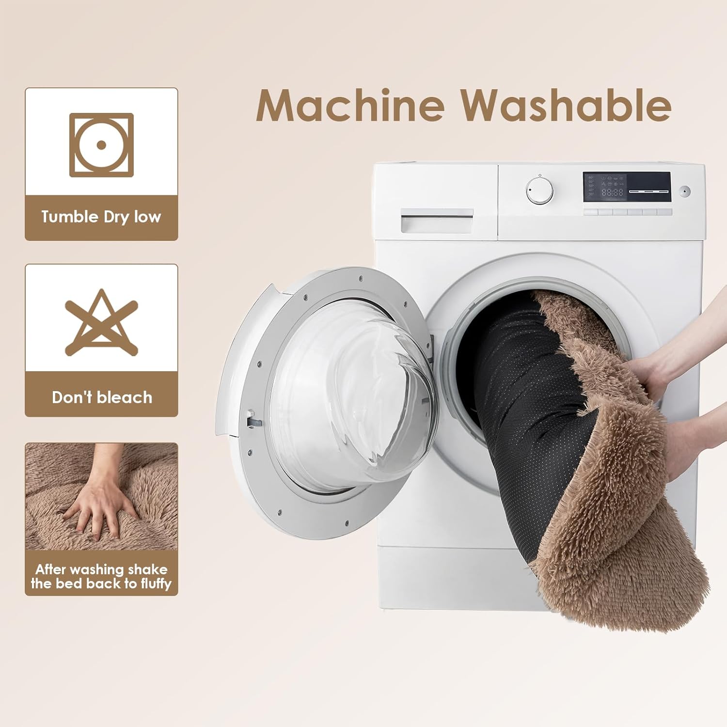 MACHINE WASH and CARE INSTRUCTION – The washable dog bed can be put directly into the washing machine as a whole. This plush dog bed is vacuum-compressed, please remove the compression bag, shake it completely, and leave it for about 24 hours to expand. After washing and before use, please shake the bed back fluffy.