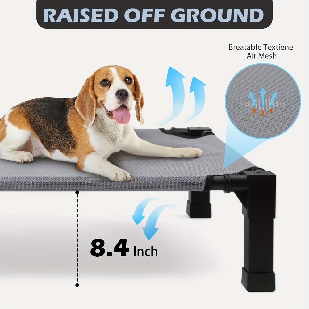 Elevated Dog Cot with Canopy: This elevated dog bed promotes airflow for a cooler resting environment. Designed to support joint health, it provides comfort for pets who find lying on hard surfaces difficult. Ideal for outdoor adventures, this portable dog cot ensures your furry friend enjoys a restful sleep anywhere.