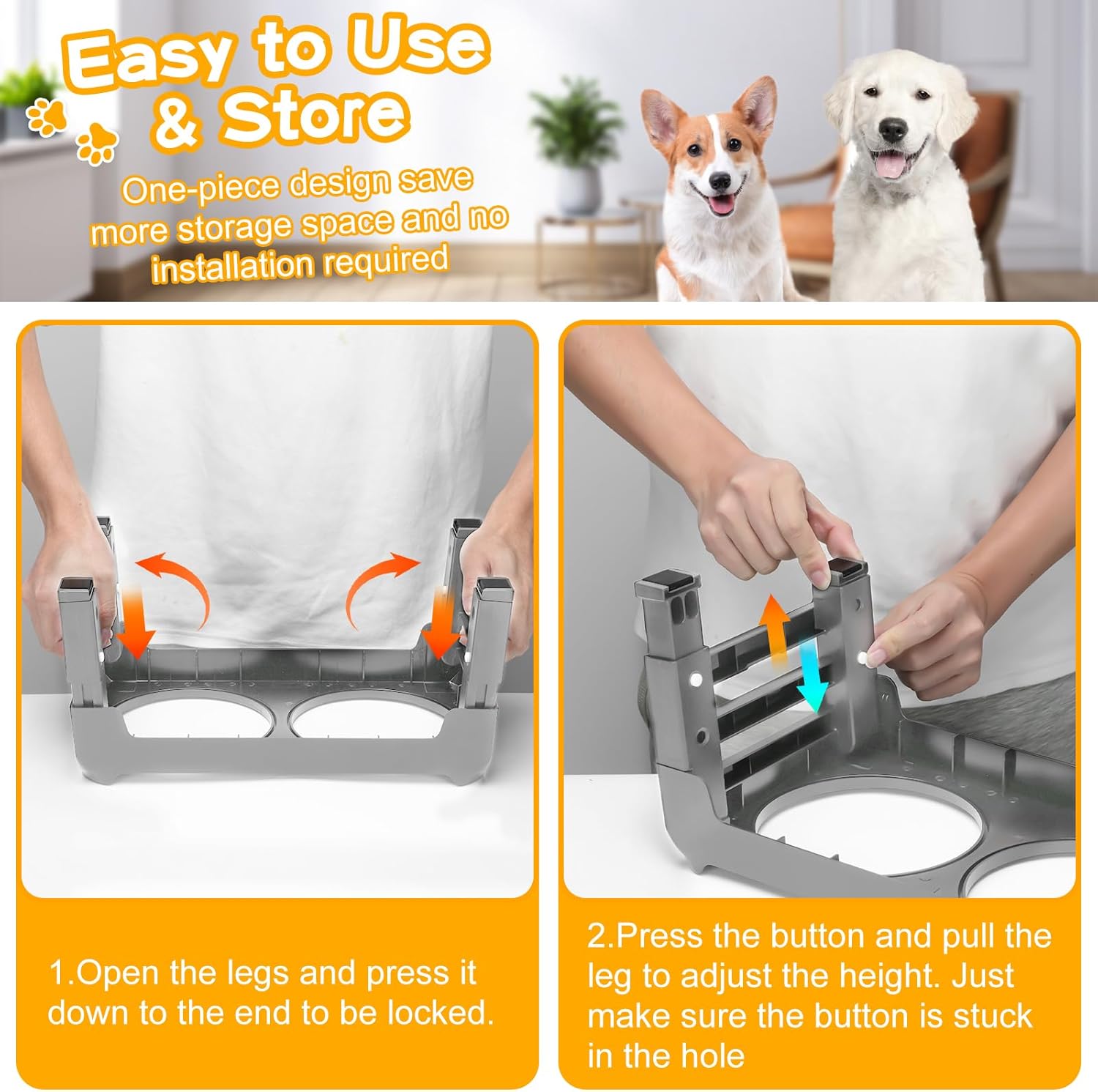 🐕No Installation & Folds Up Nice for Traveling: The detachable design and foldable legs make it easy to pack and much space-saving, perfect for both home and travel. No assembly required. Simply unfold the legs and press down to use. Adjusting the height is a breeze too – just press the white button and pull the legs to your desired height.