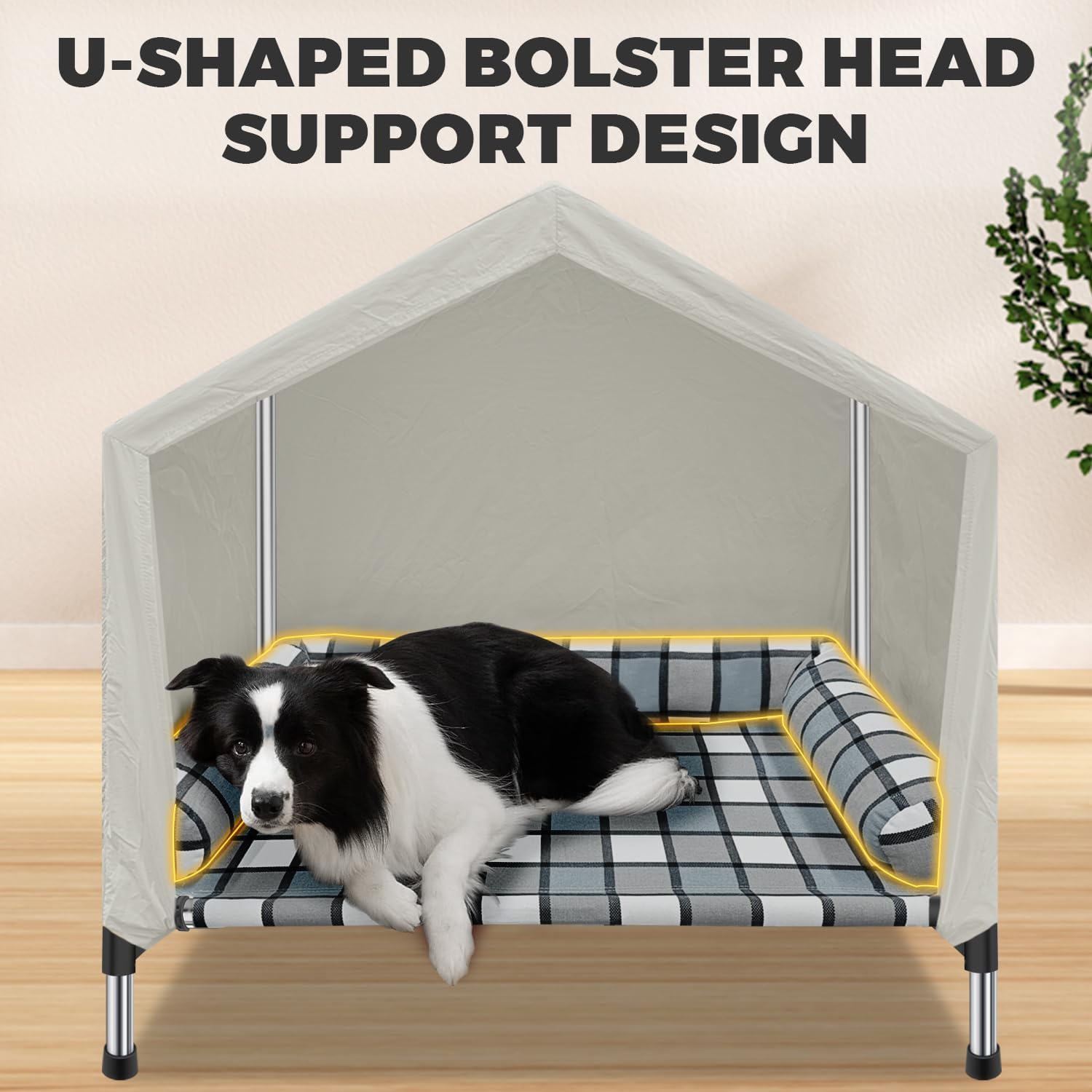 【COZY FABRIC & PILLOW SUPPORT】 The elevated dog bed house made with soft, skin-friendly fabric, this elevated dog bed features a u-shaped pillow for excellent head support, reducing spinal pressure and enhancing sleep quality. Designed for all dog sizes, it offers unmatched comfort for restful sleep.