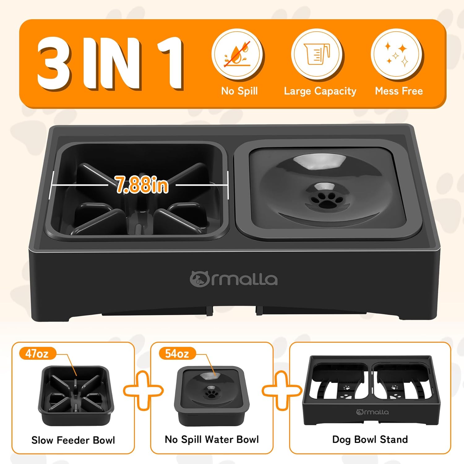 The capacity of no spill water bowl is 54oz, the slow feeder food bowl is 47oz/5.5cup.