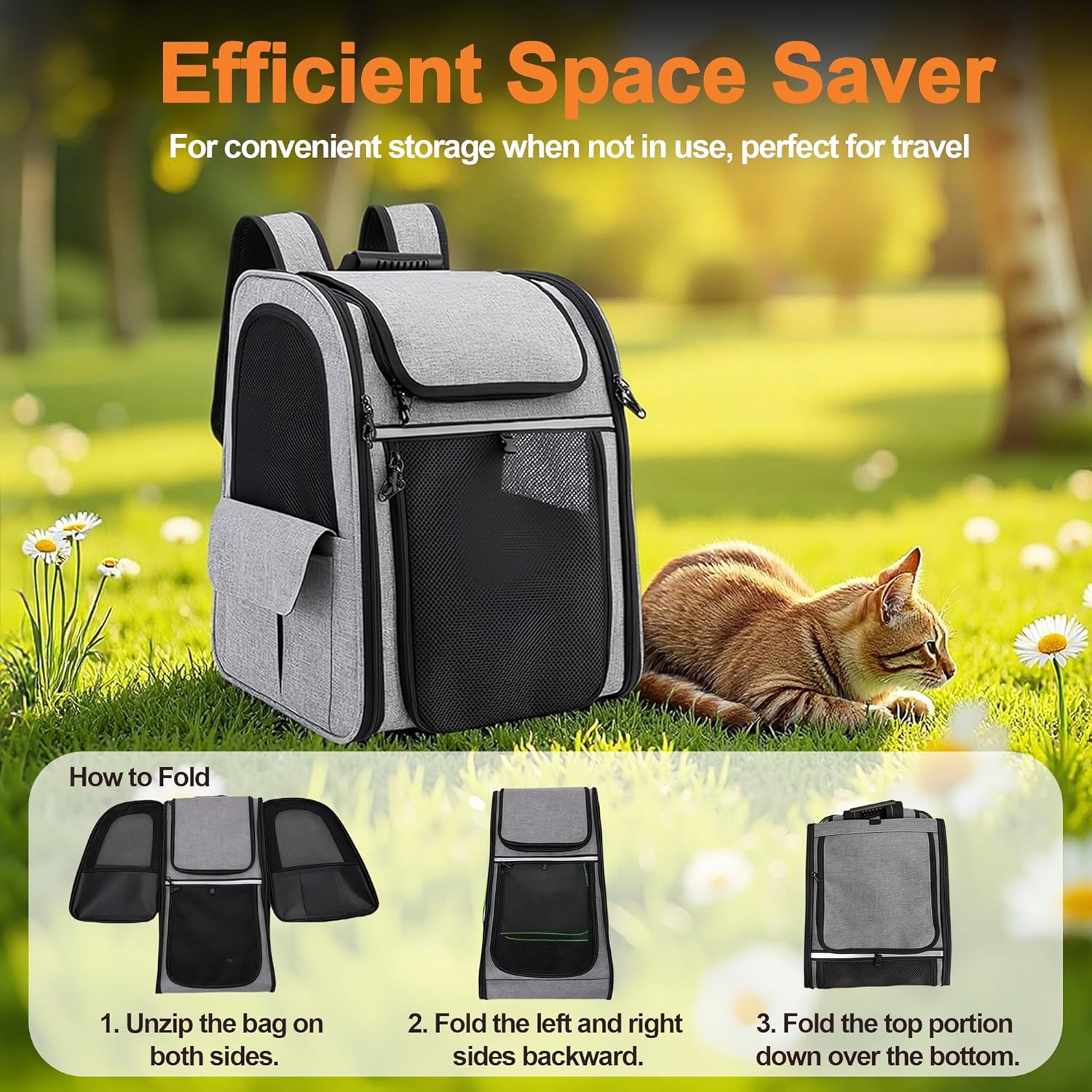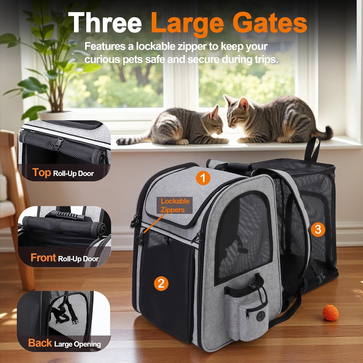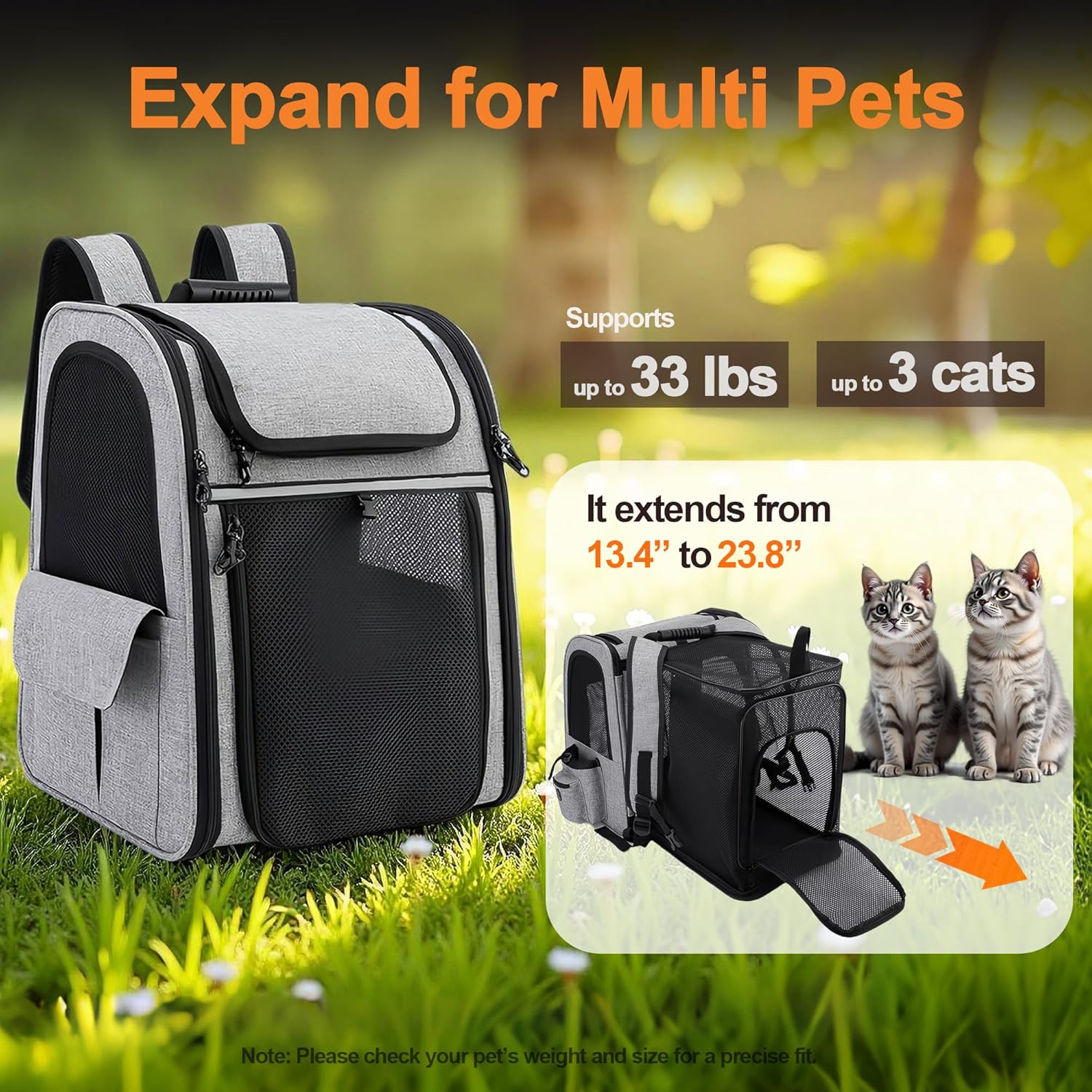 Expandable Cat Carrier Backpack – Spacious for Up to 33 lbs Large Cats Small Dogs – Two Room with Dual Side Mat – Airline Approved for Multi Pet Family Travel – Grey
