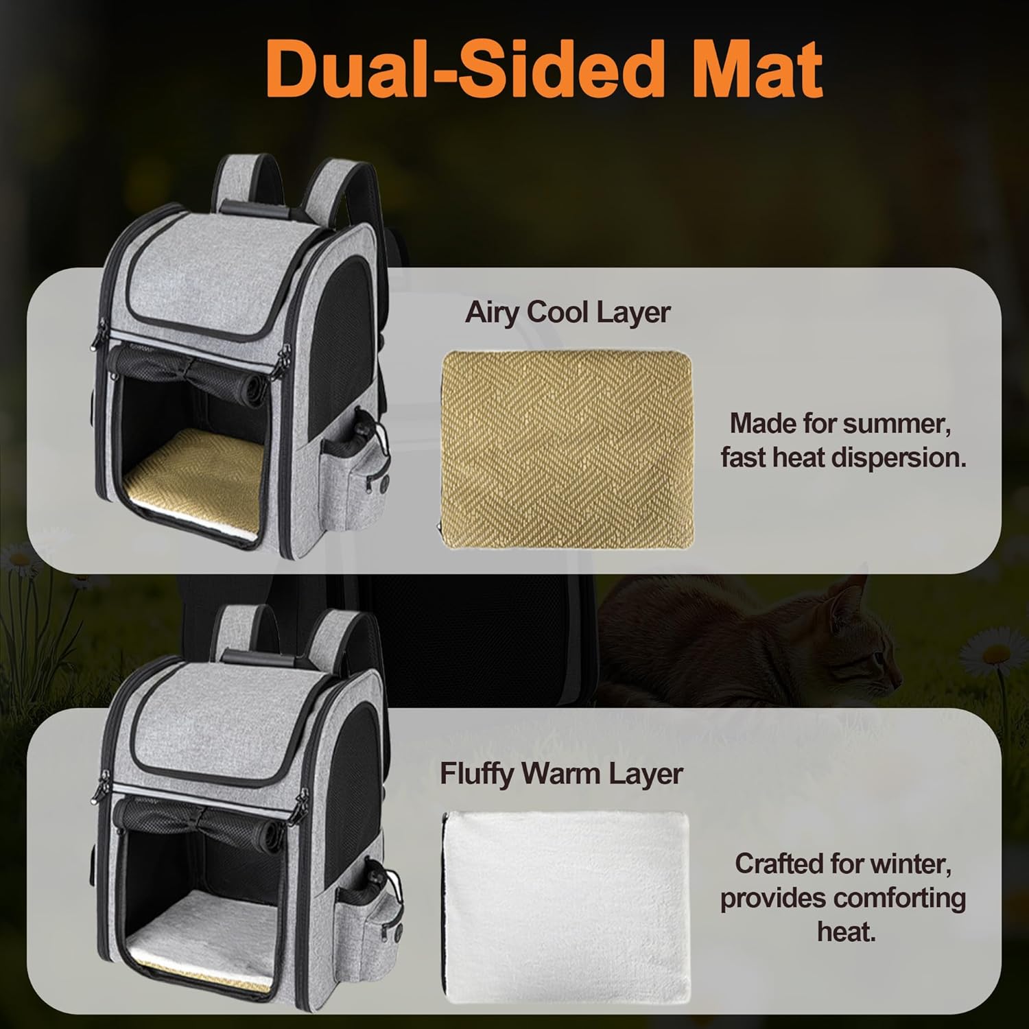 🐱🐶【Comfortable & Convenient】Equipped with adjustable straps, removable and washable bottom pad (cool mat on one side, plush on the other), reflective strips for night safety, and multiple pockets for your convenience. It also includes a pet safety leash to prevent escapes.