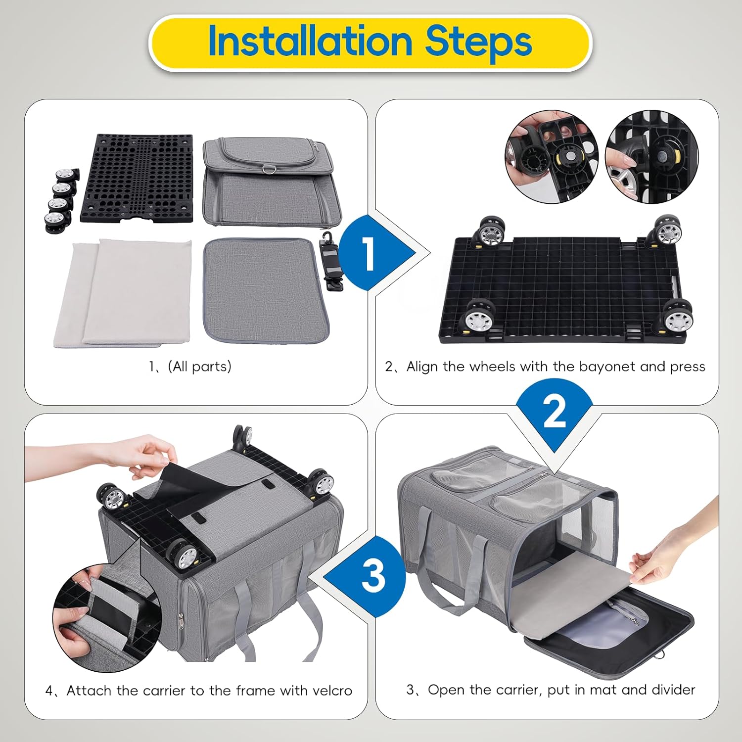Multiple Carrying Methods: The pet carrier with wheels can be pulled, carried in the car, hand-held or carried over the shoulder, very convenient. It can be used as a soft cat carrier or easily assembled to be used as a rolling pet stroller. Open the extended space by the way when resting, so that cats can get a good travelling experience.
