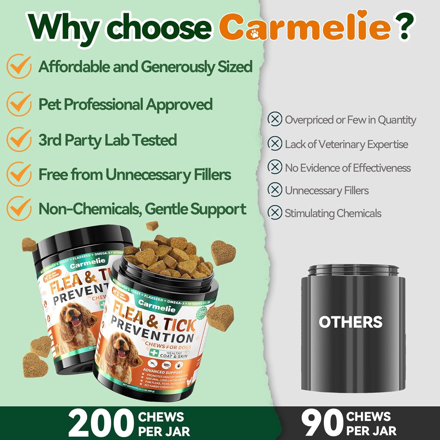 Effective Health Support: Carmelie flea and tick chews are made with only natural ingredients to ensure the safety of your beloved pet. Each soft chew is rich in coconut oil, garlic powder, flaxseed, and brewer’s yeast, and free from harsh chemicals or artificial additives. Whether for puppies or senior dogs, they can safely enjoy these chews while benefiting from multiple health supports, from flea control to skin care.