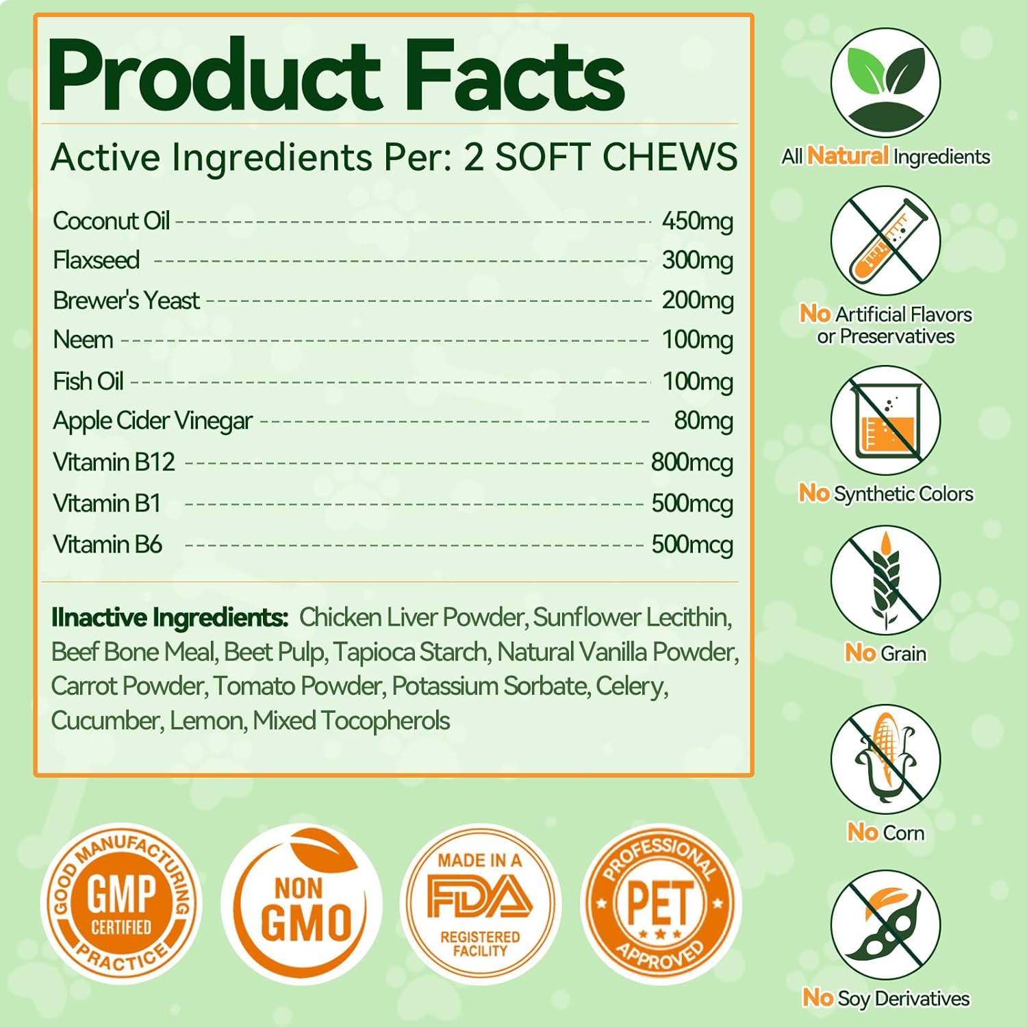 Healthy Skin & Coat: Our natural formula helps address issues like irritation, dryness, and itching caused by flea, while enhancing your dog’s overall appearance. Enriched with natural ingredients like Coconut Oil, Fish Oil, and Neem, these flea soft chews promote healthy skin and a shiny coat. Vitamin B12, B1, and B6 help nourish the coat from the inside out. They’re free from grains, corn, and soy derivatives, ensuring a natural and safe solution for your pet.