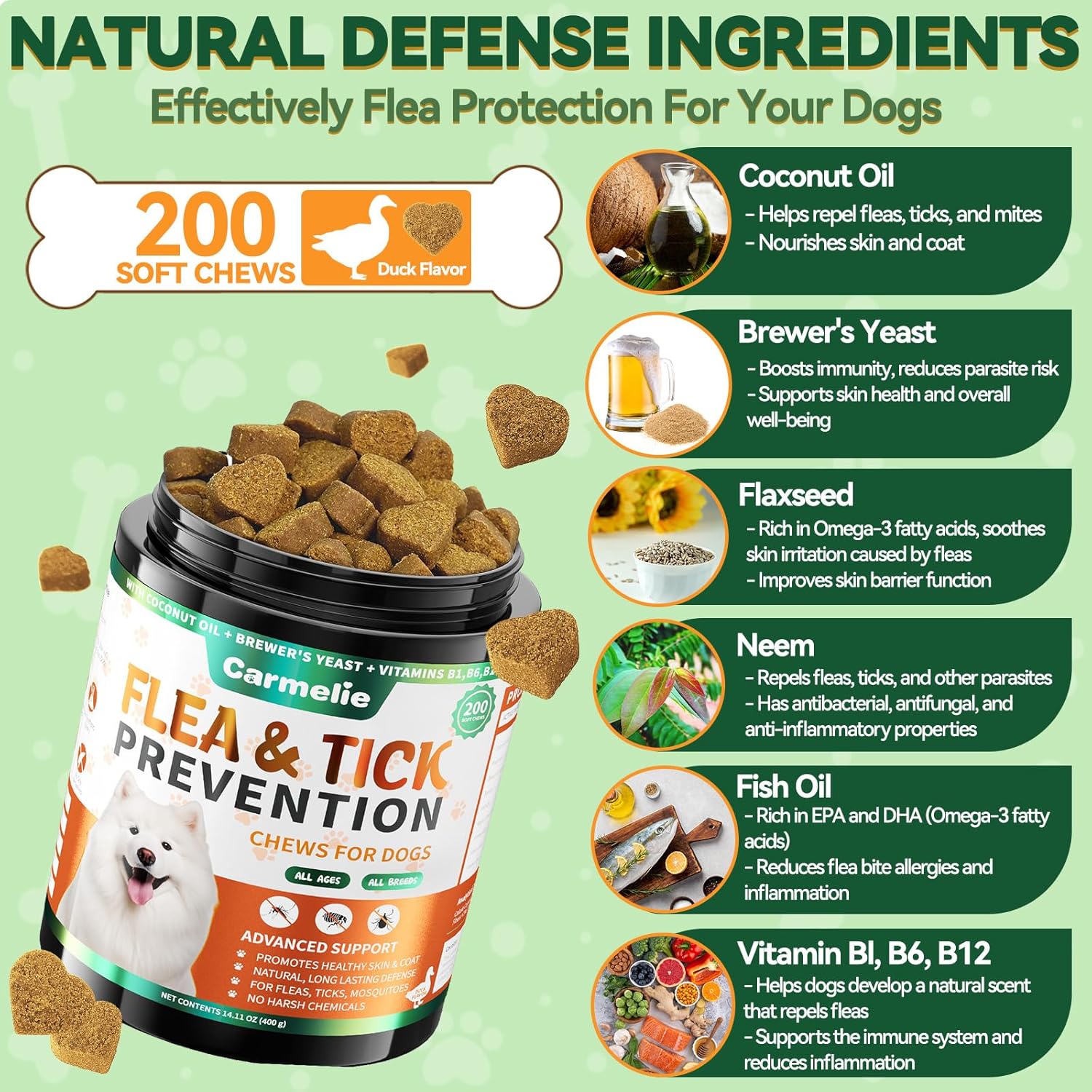 Effective Health Support: Carmelie flea and tick chews are made with only natural ingredients to ensure the safety of your beloved pet. Each soft chew is rich in coconut oil, garlic powder, flaxseed, and brewer’s yeast, and free from harsh chemicals or artificial additives. Whether for puppies or senior dogs, they can safely enjoy these chews while benefiting from multiple health supports, from flea control to skin care.