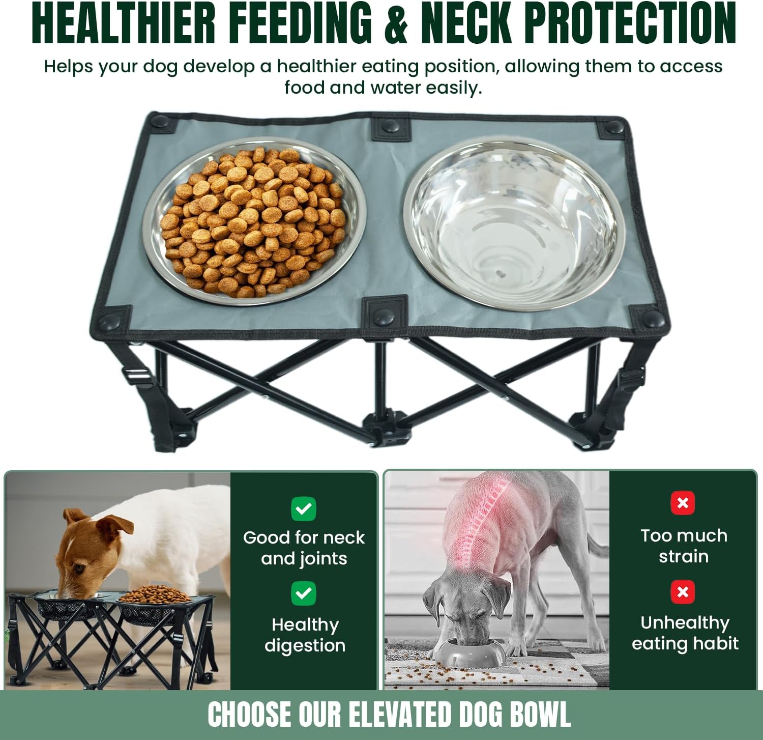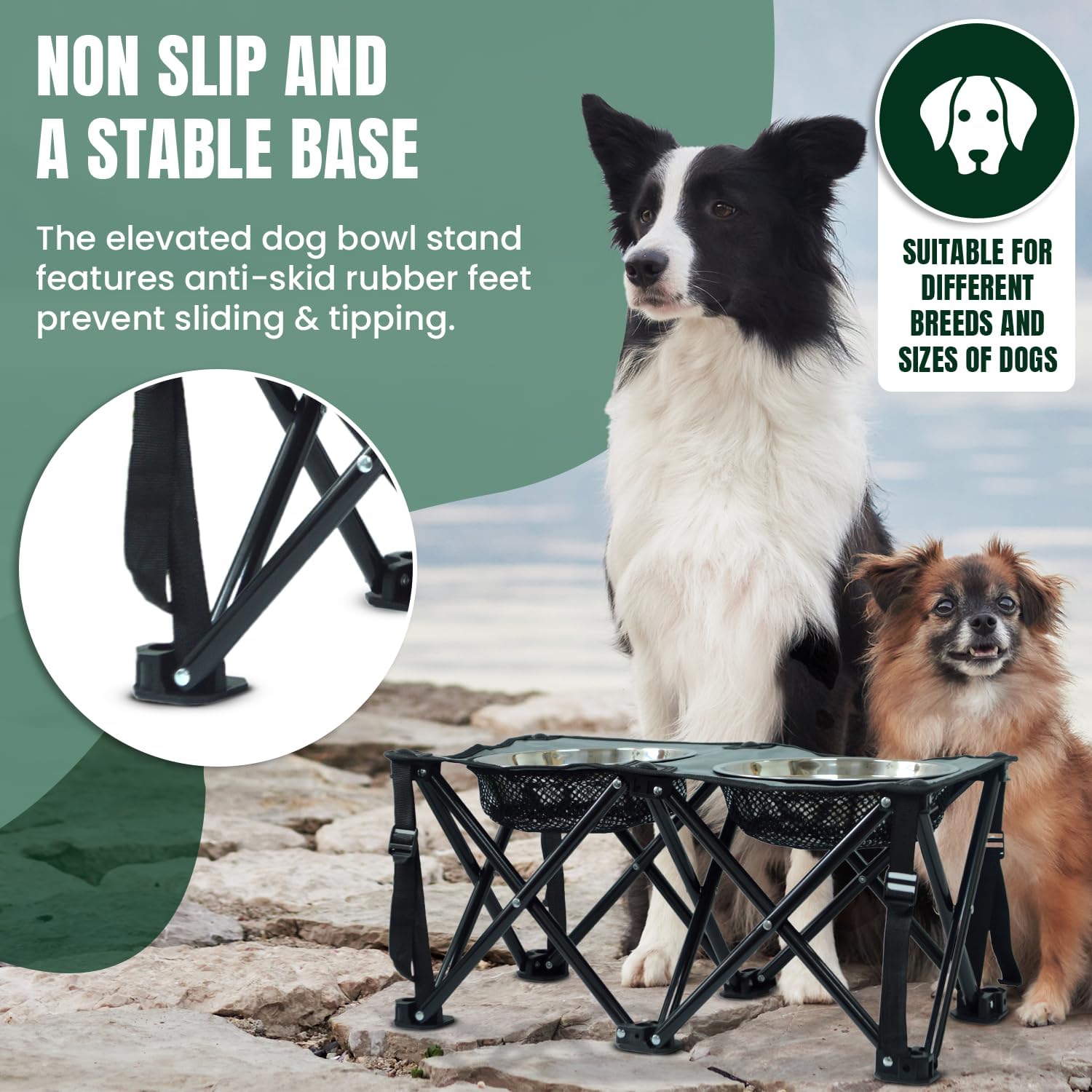𝐅𝐨𝐥𝐝𝐚𝐛𝐥𝐞 & 𝐒𝐩𝐚𝐜𝐞-𝐒𝐚𝐯𝐢𝐧𝐠 𝐃𝐞𝐬𝐢𝐠𝐧 – Our Dog food bowl stand can easily collapse for convenient storage & travel. Ideal for home, camping, & outdoor use, making mealtime mess-free anywhere.