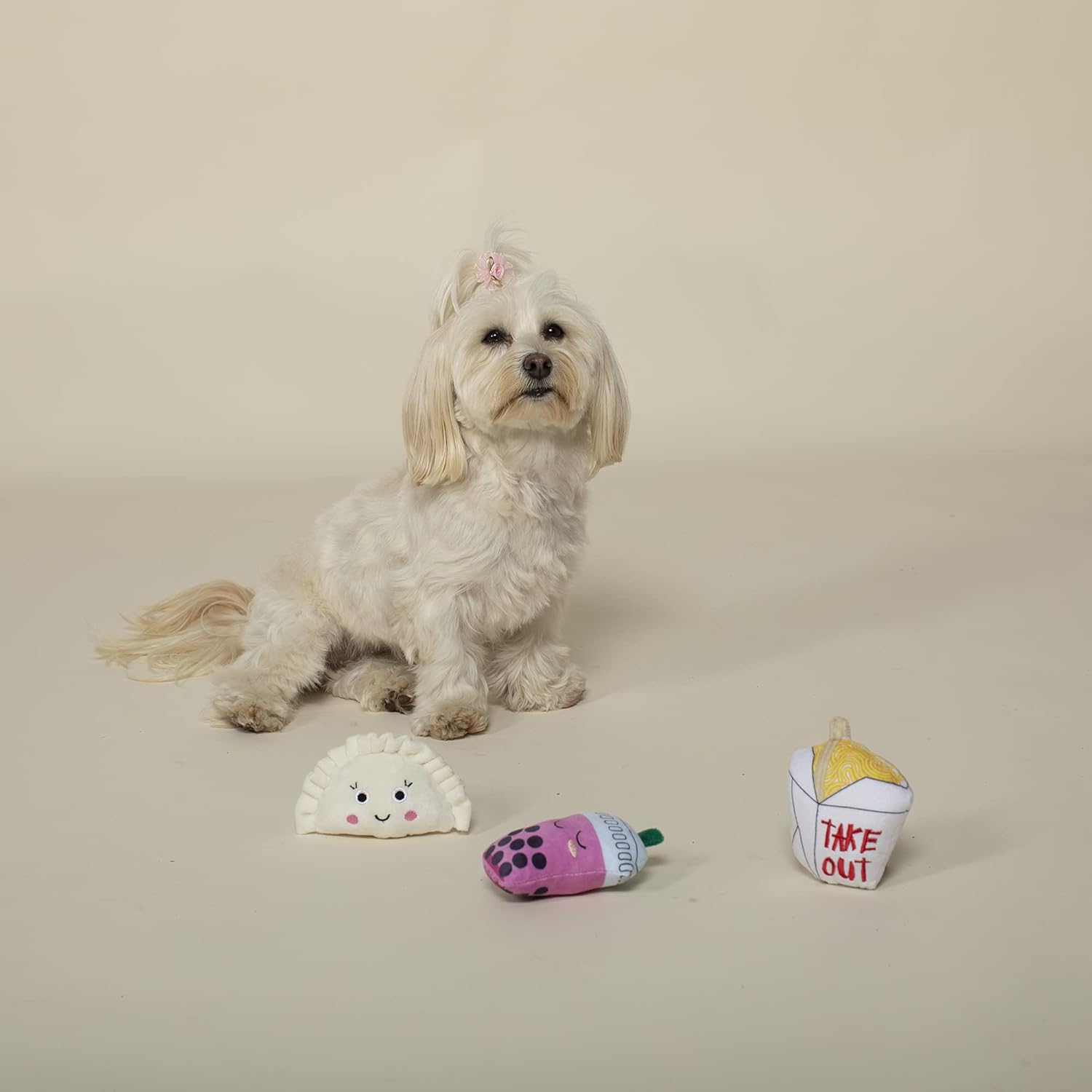 We speak yummy! Petshop by Fringe Studio “Take Me Out” mini toy set is perfect for the pup that likes to play all day. Made with a loud squeaker in each toy and stuffed with fluff, this trio is sure to keep your pup entertained and hungry for more. Great for small dogs and not intended for aggressive chewers.
