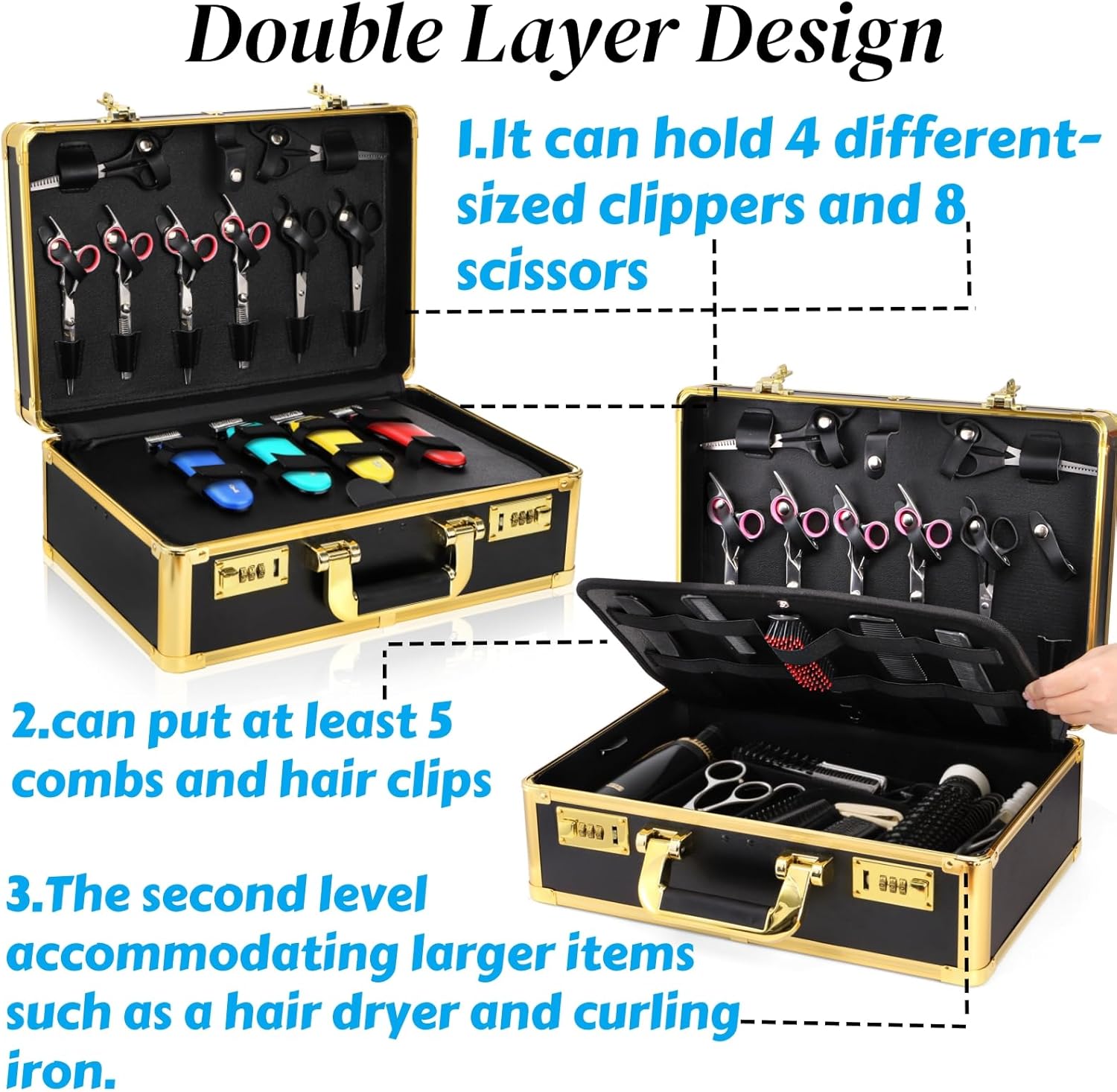 Double Layer Large Capacity: The barber supplies case features a spacious double layer design. Each pair of scissors and clippers has its own storage area, which is neatly organized and provides easy access to the tools you need. It can hold 4 different-sized clippers and 8 scissors, with the second level accommodating larger items such as a hair dryer and curling iron.