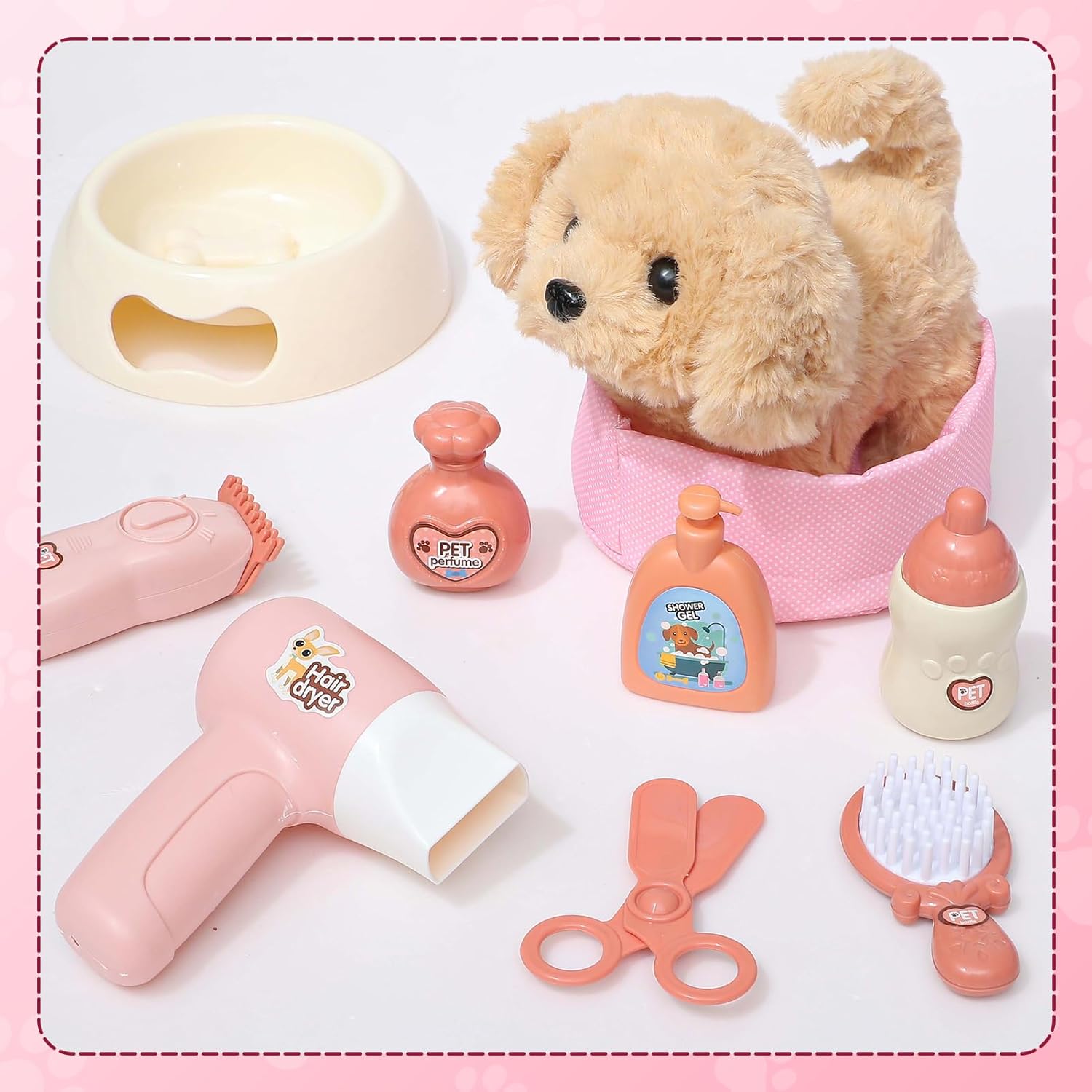 PET CARE&BEAUTY PLAYSET : Our toy dog for kids comes with an electronic dog toy, a plastic dog carrier, 5pcs dog feeding kit(dog basin, bone, baby bottle, dog leash, dog kennel), and 6pcs dog beauty supplies, that kids will love using the hairdryer, scissors, hair clipper, comb, shower gel, and pet perfume to pamper their plush pup. The pet bottle and dog kennel add to the realism, while the bone and dog leash provide for outdoor adventures