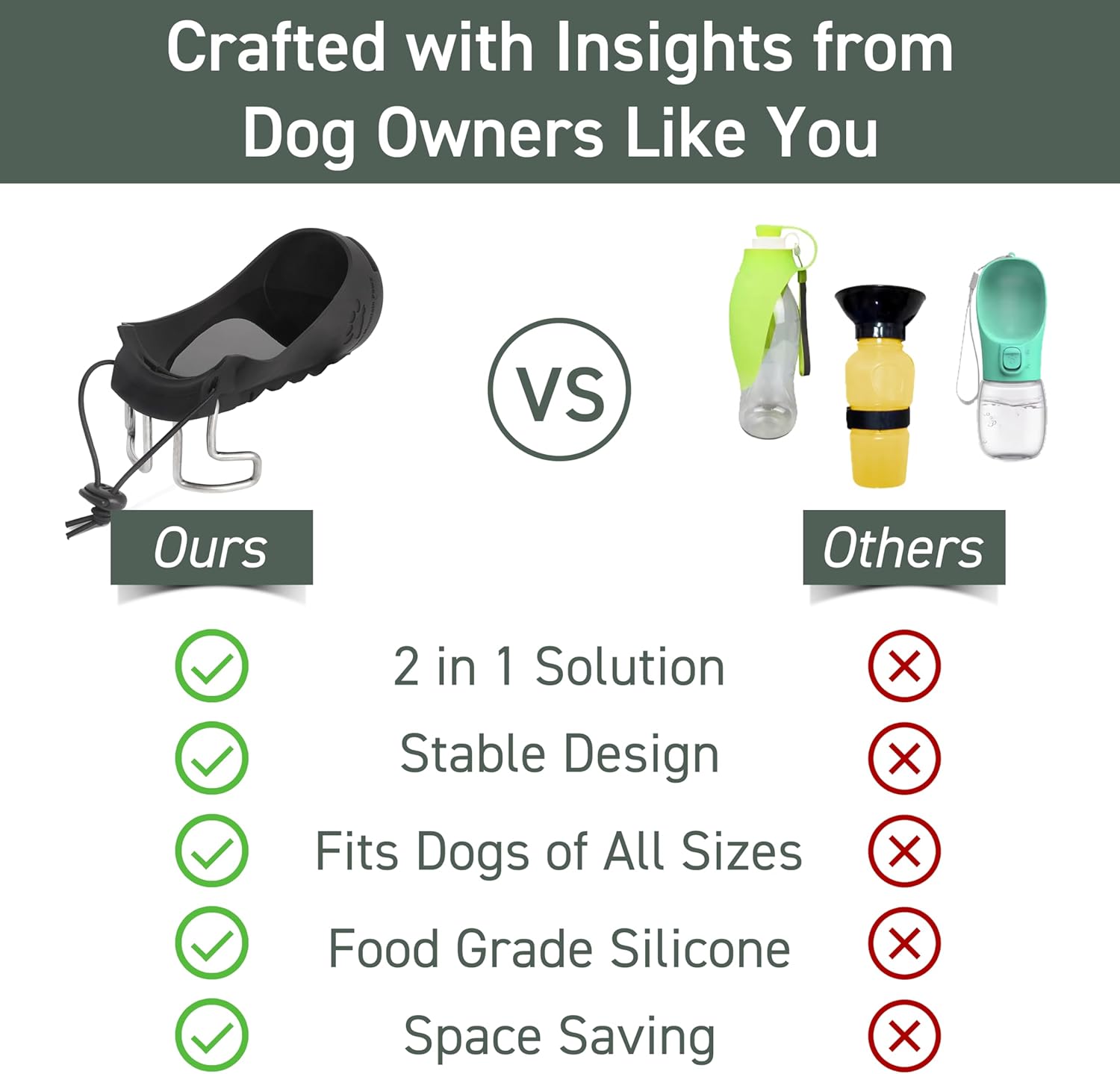 Stable Kickstand Design – Steady on Any Terrain: The retractable kickstand keeps the bowl steady on rocky trails, grass, and gravel. A must have dog water bottle for your travel and dog hiking gear accessories