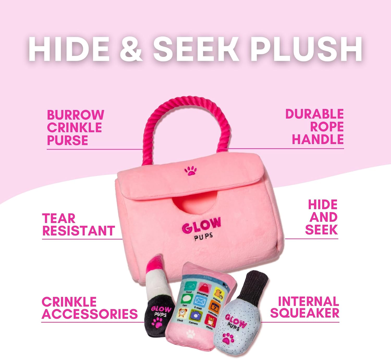Hide and Seek Dog Toy, Pink Purse Plush Dog Toy with Squeakers, Crinkle Material & Rope Handle, Interactive Plush Lipstick, Cell Phone & Nail Polish Toys for Small Dogs – Pink/Fuchsia