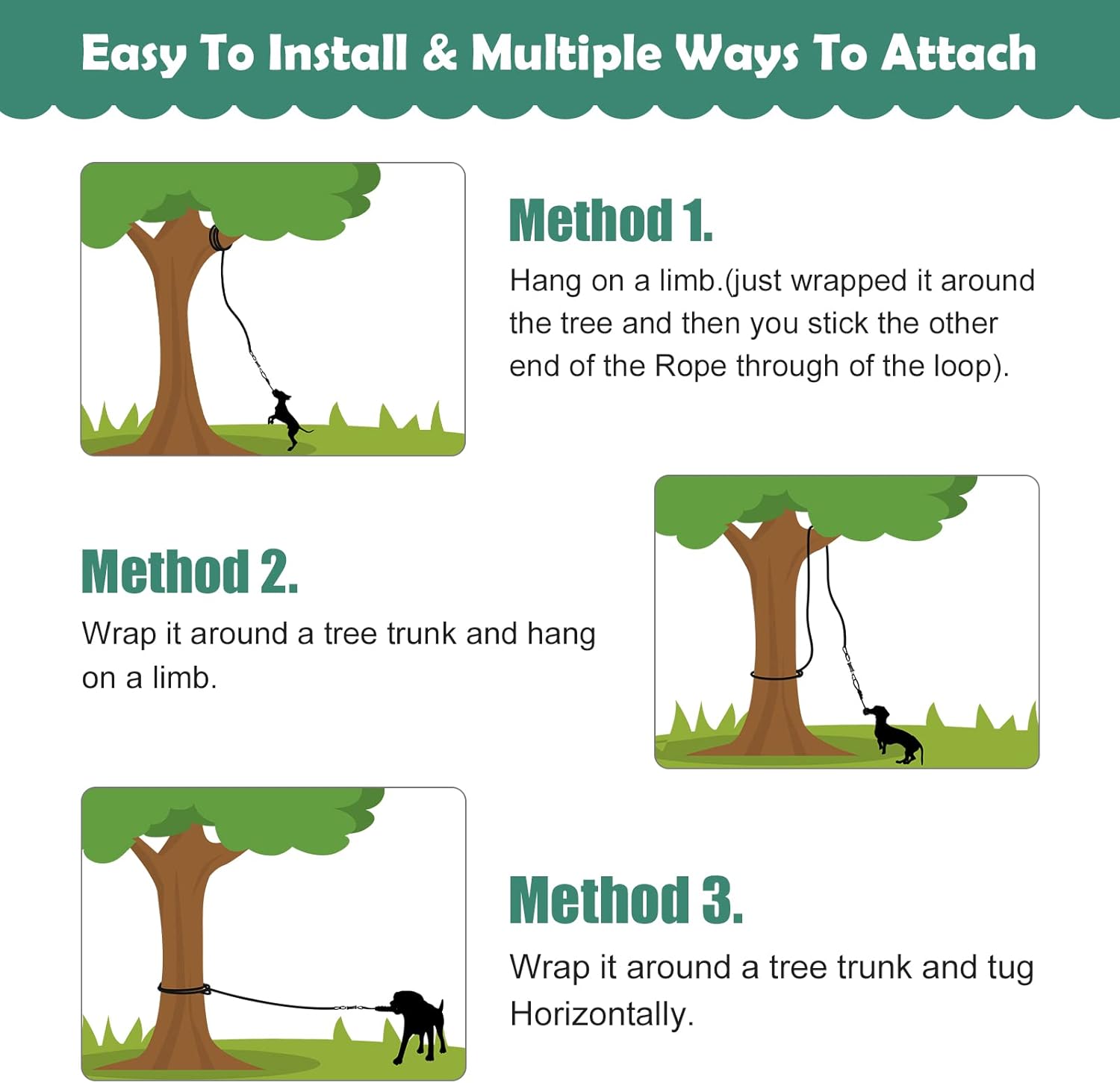 🎄🎁【SOLO PLAY】Life gets busy. we don’t have time and energy to accompany our dog to play games together. The tether dog tug toy attracts the dog’s chase in the shaking and swing. Pulling and tugging make them endlessly busy, which can relieve dogs’ boredom. Dogs can play it all day by themselves. It’s perfect for your dogs to play tug-of-war games and it does not tear your arms up. The dog tree tug toy is like the flirt pole. Fun for them, and fun for you to watch!