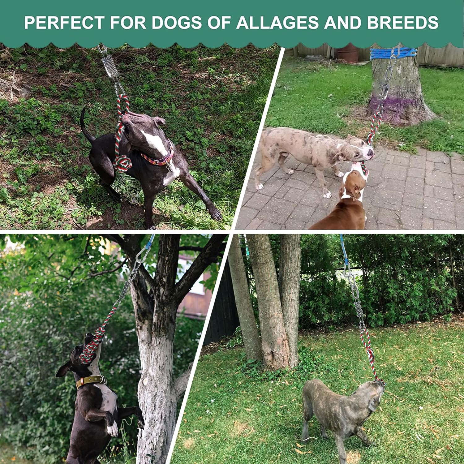 🎄【EASY TO HANG & ADJUSTABLE】16ft long dog rope toys for large dogs, and you can toss the bungee cord over the strong tree limb, loop it, and pull it. Of course, you can also hang the dog toys for aggressive chewers from a tree branch, wood beam, patio, and other things that have some height for support. You can adjust the height of the dog rope toys to make this interactive spring pole toy more challenging for your furry friends