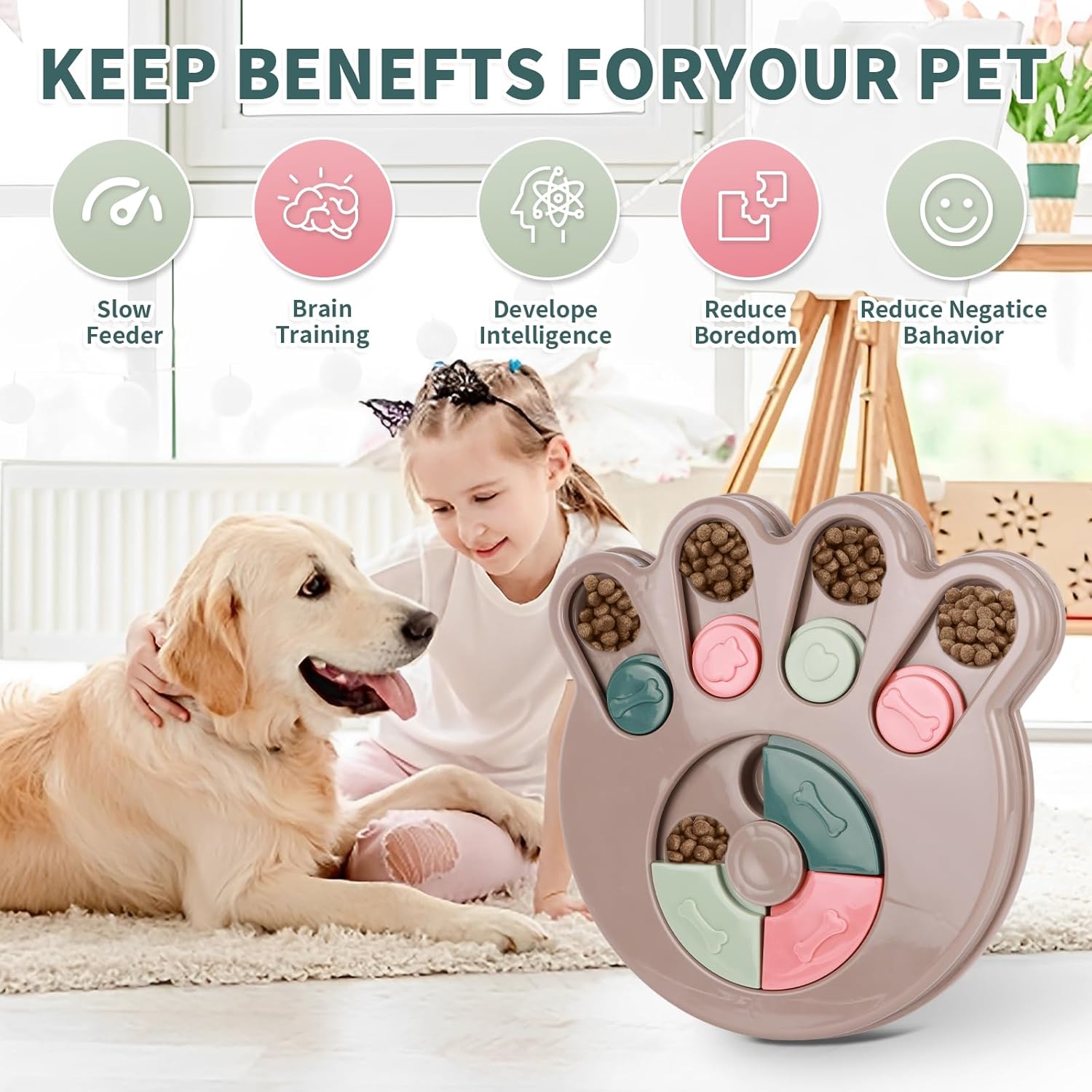 The 14-Grid Paw & Bone Puzzle System features sliding lids with textured bone-shaped knobs and paw-print grooves. Each compartment releases 1-3 kibble pieces per interaction, extending mealtime by 18-25 minutes (tested with 1 cup kibble). The staggered lid angles force dogs to alternate between sliding, nudging, and sniffing – mimicking natural foraging behavior to prevent rapid gulping.